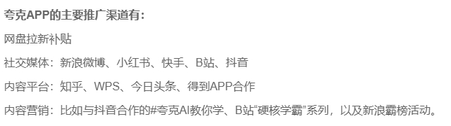 在DeepSeek免费开源引爆全网后,各个大厂的重点逐渐从研发AI大模型到AI应用上。AI Agent(智能体)产品Manus“刷屏”社交平台,阿里也大力推广夸克AI搜索框,以下是夸克相关营销渠道: