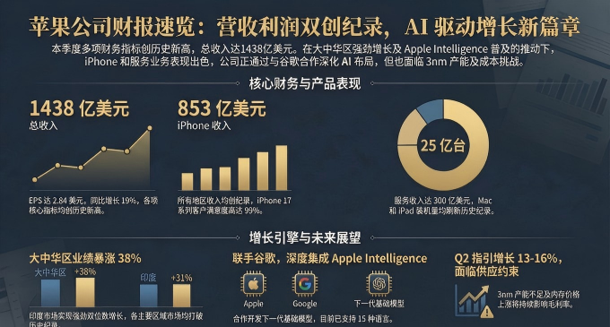 苹果再一次用数字证明了,它依然是全球移动生态无可争议的“引力中心”。 1月30日,苹果公布了2026财年第一财季报告,1438亿美元的营收不仅创下历史新高,大中华区更是交出了同比暴增38%的惊人答卷。在iPhone 17系列如火如荼的拉动下,库克自豪地宣布:苹果全球活跃设备安装量已正式突破 25 亿台。