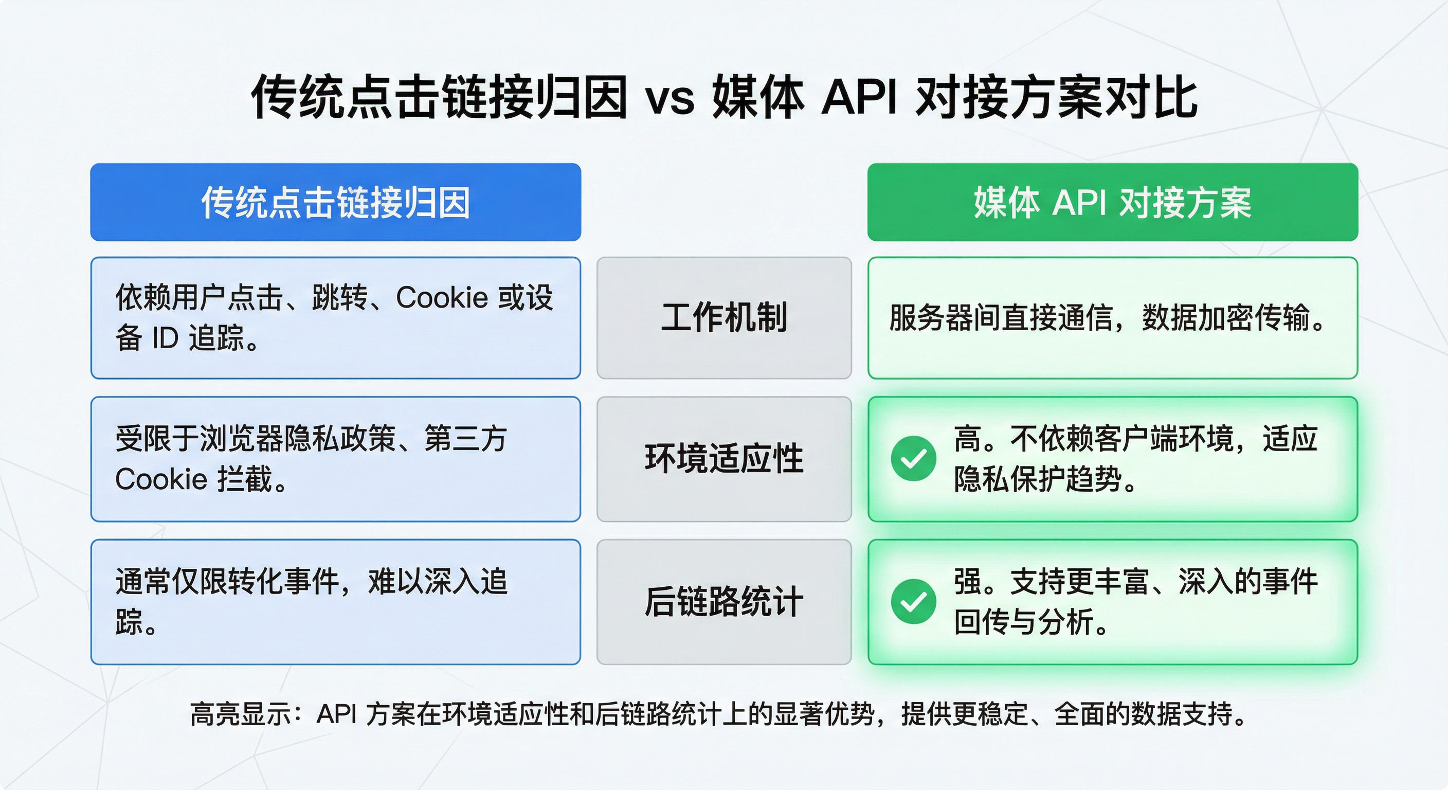 API 对接属于 Server-to-Server 模式,具备极高的稳定性。它不依赖浏览器跳转的稳定性,能穿透微信等封闭环境,并支持回传更深层级的后链路行为数据(如付费额度、用户等级),是进行精准 ROI分析 的前提。
