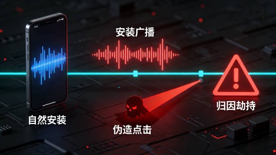 首先是 归因劫持(Install Hijacking) 的泛滥。恶意软件潜伏在用户设备中,通过监听应用安装广播(Broadcast Receiver),在用户自然下载 App 即将完成的瞬间,伪造一次虚假的广告点击上报。如果缺乏深度的 如何追踪广告安装来源 分析能力,归因系统会将这次自然安装误判给作弊渠道,导致广告主为“原本就属于自己的用户”支付昂贵的买量费用。
