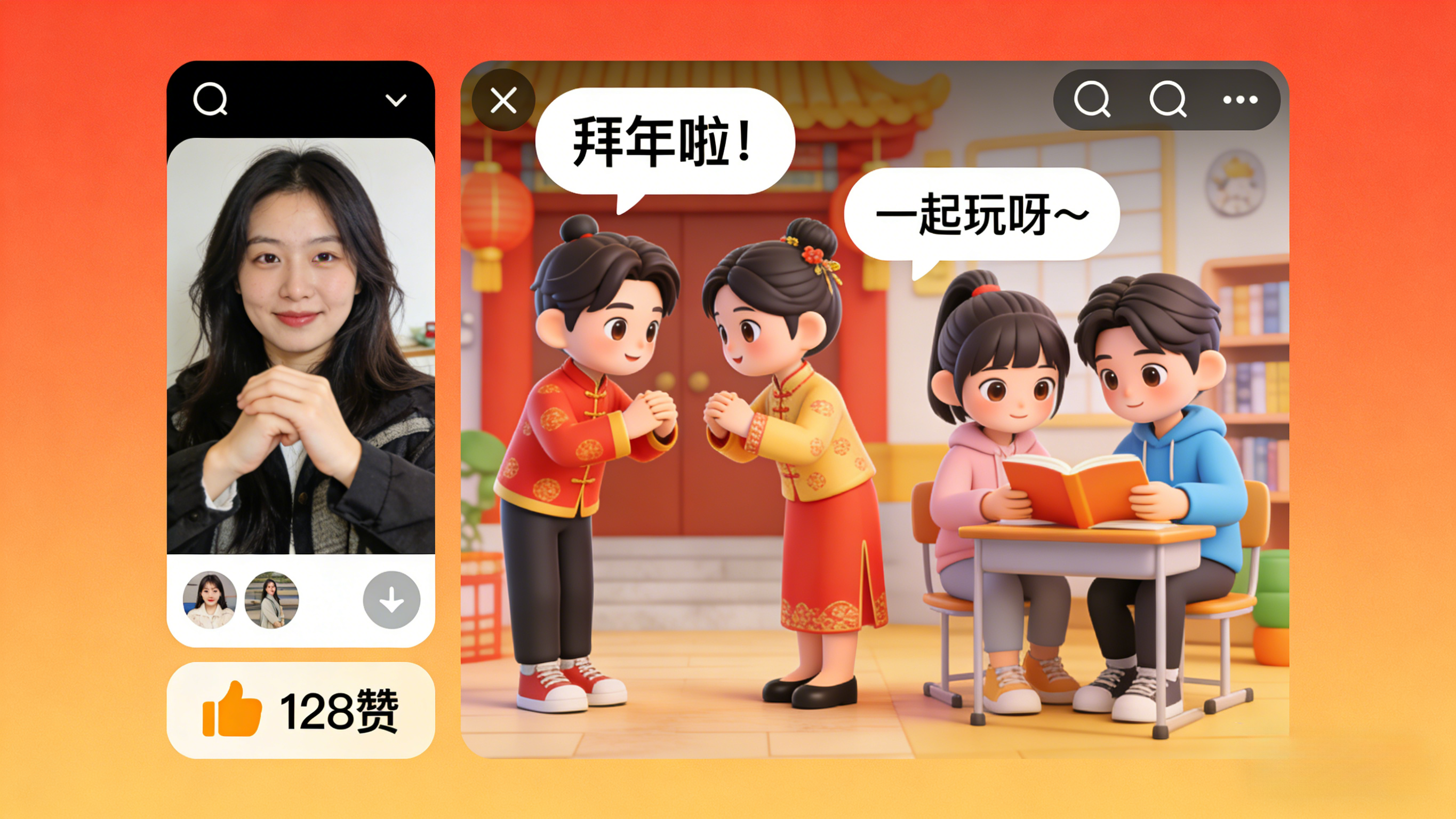 在“脑洞秀”的业务闭环中,用户体验被简化到了极致:只需上传一张照片,AI 便能瞬间生成专属的 3D 形象。真正的杀招在于“共创”——用户可以一键邀请 QQ 好友的虚拟形象共同参演,从重温“宿舍糗事”到演绎“异地恋故事”,甚至录制一段全家福式的创意拜年视频。这种“照片+一句话=一部小剧场”的轻量化玩法,让每一位普通用户都成了具备内容生产能力的“导演”。生成的视频通过说说、群聊等社交渠道爆发式扩散,成为春节期间最抢手的社交谈资。