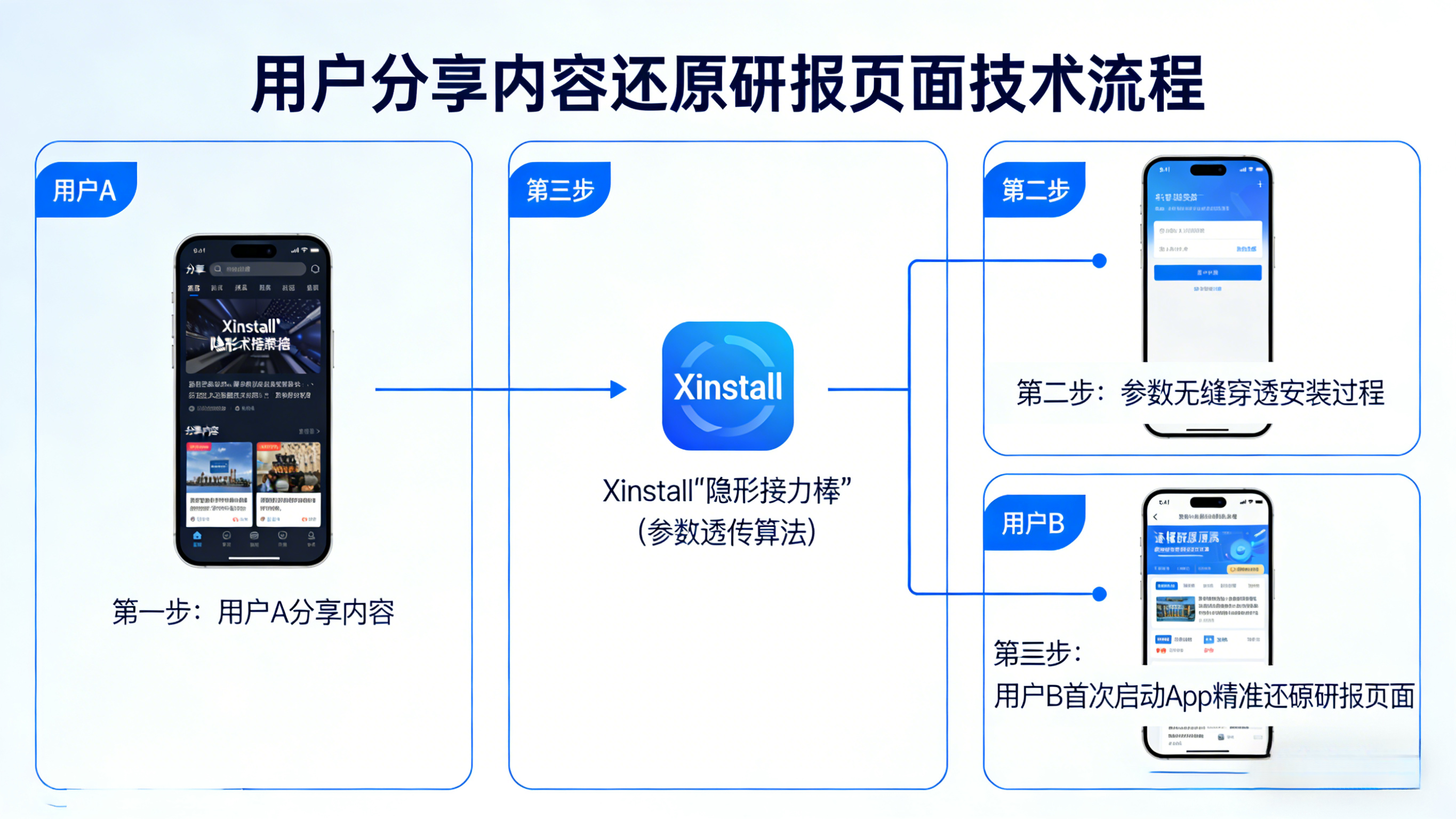 利用智能传参(如 Xinstall 提供的延迟深度链接技术),当用户 A 分享那份“AI 研报”时,系统会在分享链接中隐蔽地挂载特定参数(如 content_id=report_001)。
