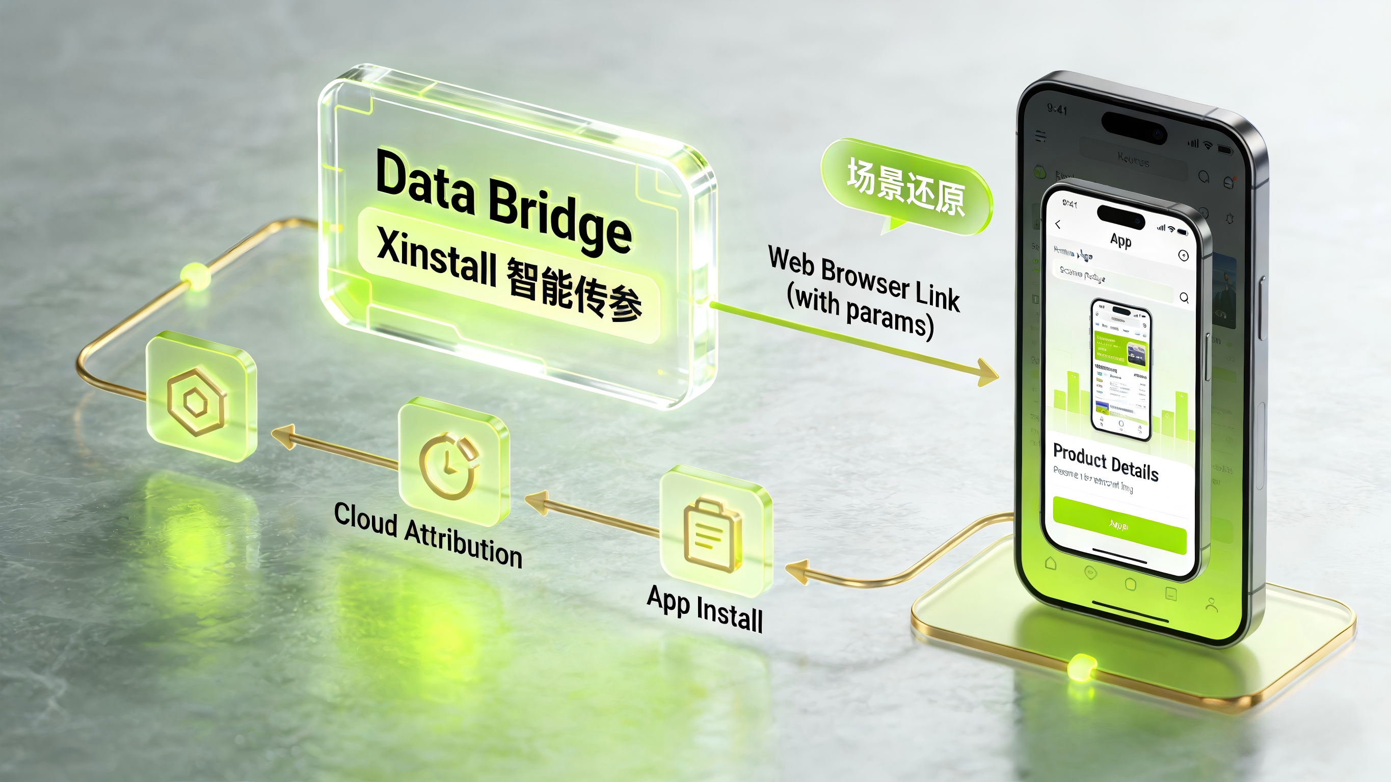 针对尚未安装 App 的新用户,挑战在于如何让商品信息“活过”应用商店的下载黑洞。通过引入 智能传参安装 技术,当用户点击站外链接跳转下载时,系统会在云端短暂挂起包含该商品 ID(如 item_id=lululemon_yellow)的场景参数。当用户首次启动 App 时,底层 SDK 会在毫秒级内读取这些参数,并触发“场景还原”——新用户一进来,眼前弹出的直接就是那根发圈的抢购页面。这种跨端无缝体验,能将拉新到首单的转化率拉升数倍。