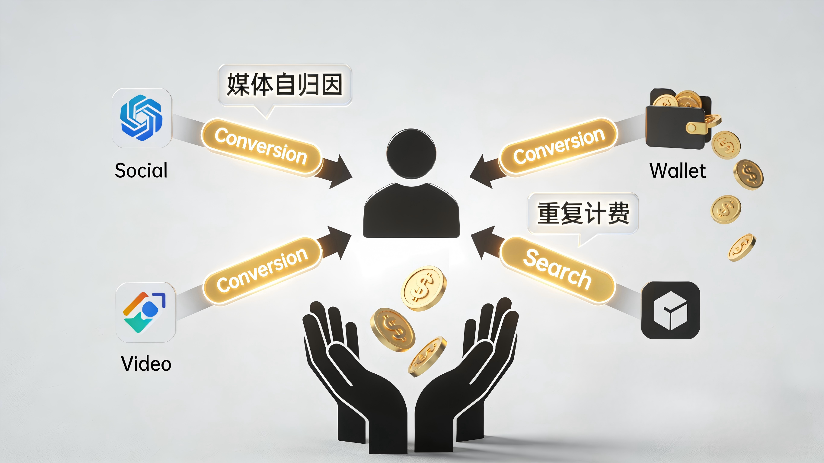 这是最直接的预算黑洞。假设一个真实用户在 A 平台看到了信息流广告,随后在 B 平台点击了短视频链接,最终几天后在 C 应用商店通过搜索完成了下载激活。在行业极其宽松的“自归因(Self-Reporting)”规则下,A、B、C 三家媒体的后台都会认为这个新增用户是自己带来的,并在报表上各自记下一次转化。结果就是,企业为这 1 个真实用户支付了 3 笔推广费用,导致各平台单看 CPA(获客成本)都很低,但整体均摊下来的真实成本却高得离谱。