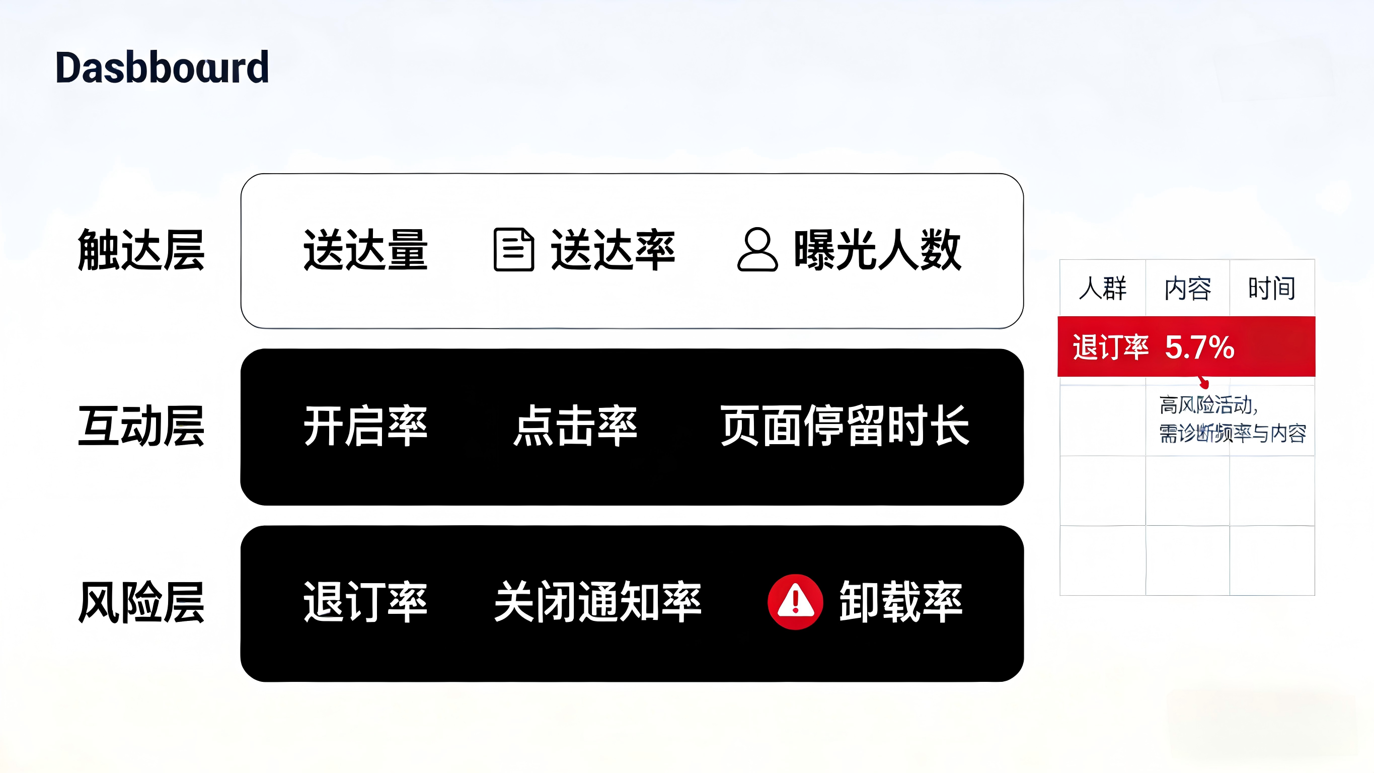 | 触达层 | 送达量、送达率、曝光人数 | 判断通道与技术端是否稳定 |