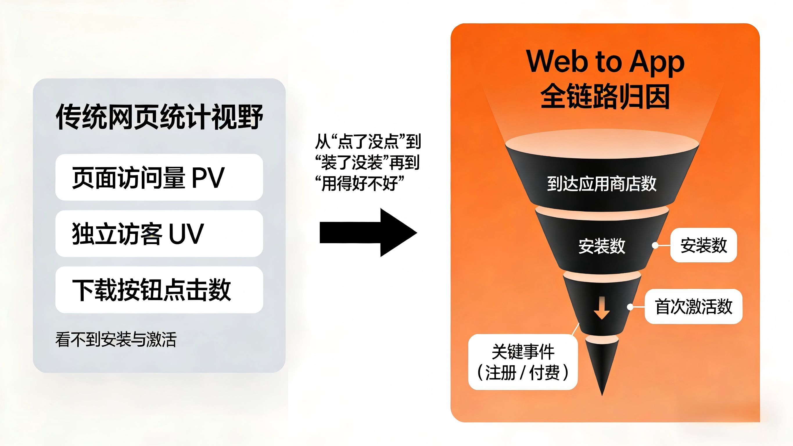 在大多数团队的早期实践中,做 Web to App 时只是在 H5 页面上集成一个网站统计脚本(如传统的 PV / UV 工具),顺手给“下载按钮”加一个点击事件,用来粗略估算下载兴趣。[web:83]但随着买量成本持续上涨和隐私政策收紧,这种“只看点击不看安装”的粗粒度统计方式很快暴露出巨大缺陷:报表上看起来点击很多,实际新增却始终上不去。[web:86]