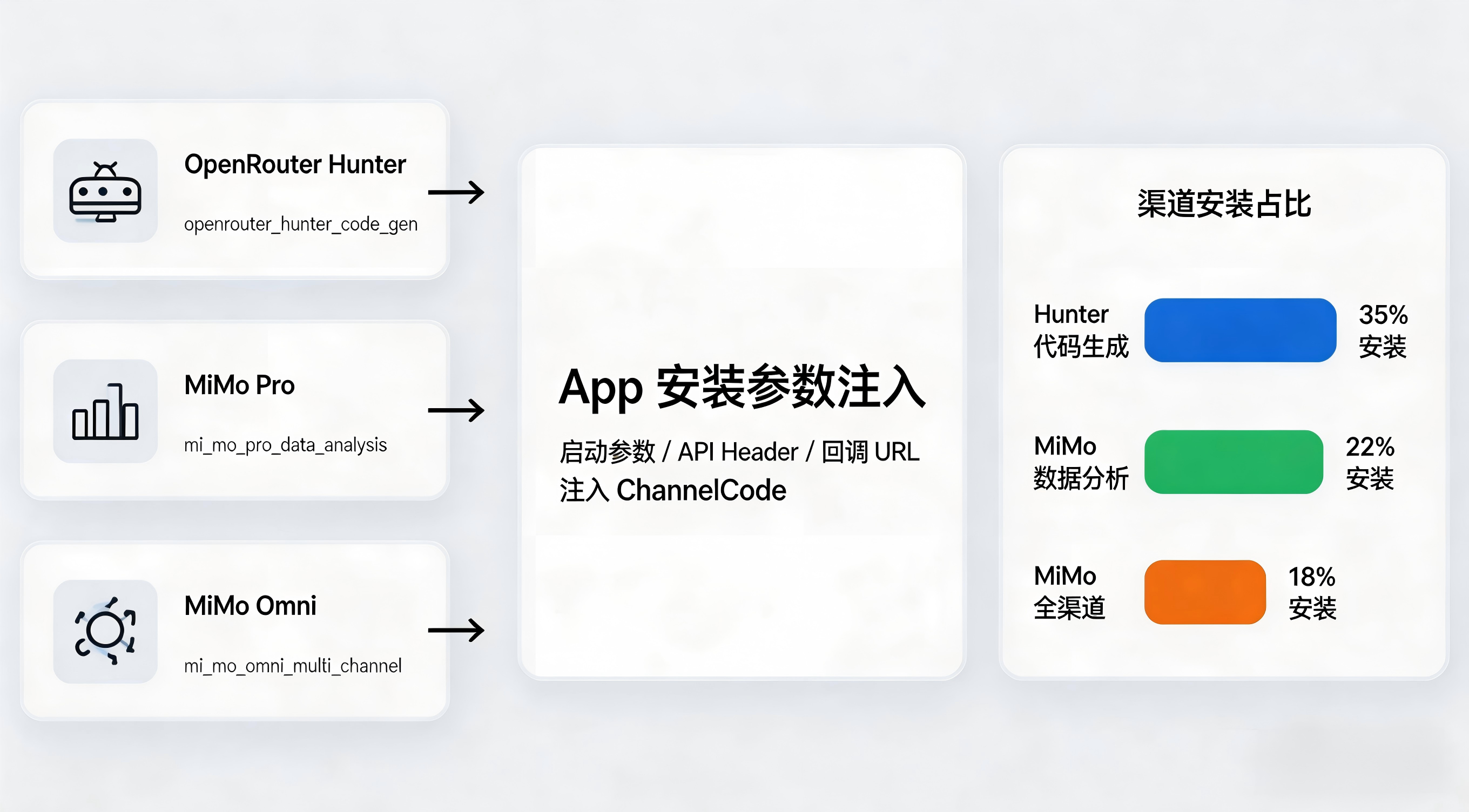 mi_mo_pro、openrouter_hunter、mi_omni)。mi_mo_pro_data_analysis、openrouter_hunter_code_gen)。好处是:后台能直接看到“本周来自 Hunter Alpha 的任务流量贡献了 15% 新安装,其中代码生成入口的留存率最高 35%”。这套体系不依赖单一平台 SDK,而是通用到任何终端大模型。