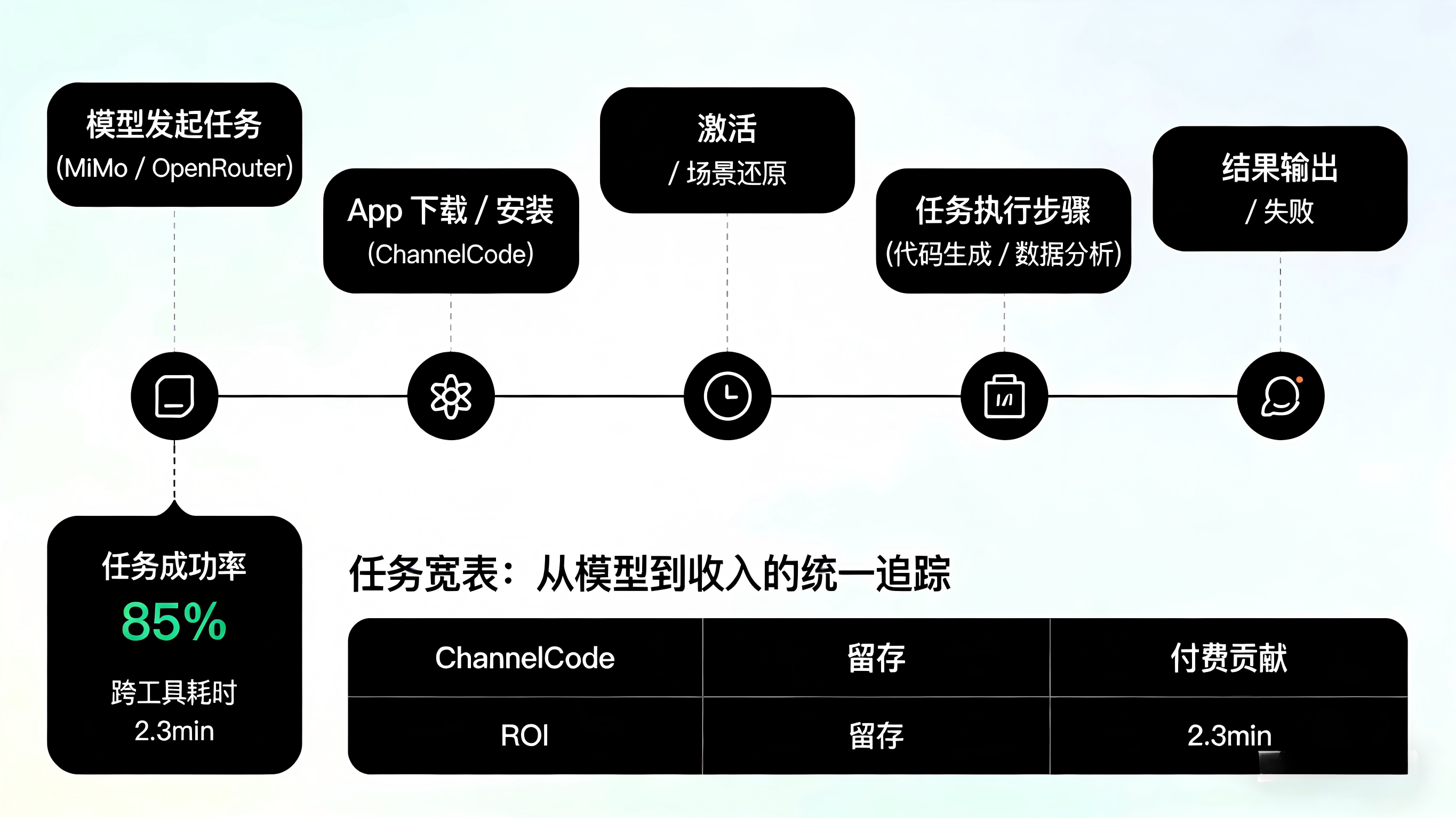 当终端厂商像小米这样,把超大模型快速推向 OpenRouter 等开发者平台,并以零成本高性能吸引海量调用时,App 的分发环境会发生什么变化?简单说:更多任务会从这些模型平台发起,用户在对话中一句话,就能触发下载、安装、激活甚至任务执行;但后台数据如果跟不上,就只能看到“多了一堆安装”,却不知道是哪个模型、哪个任务模板、哪个入口带来的。