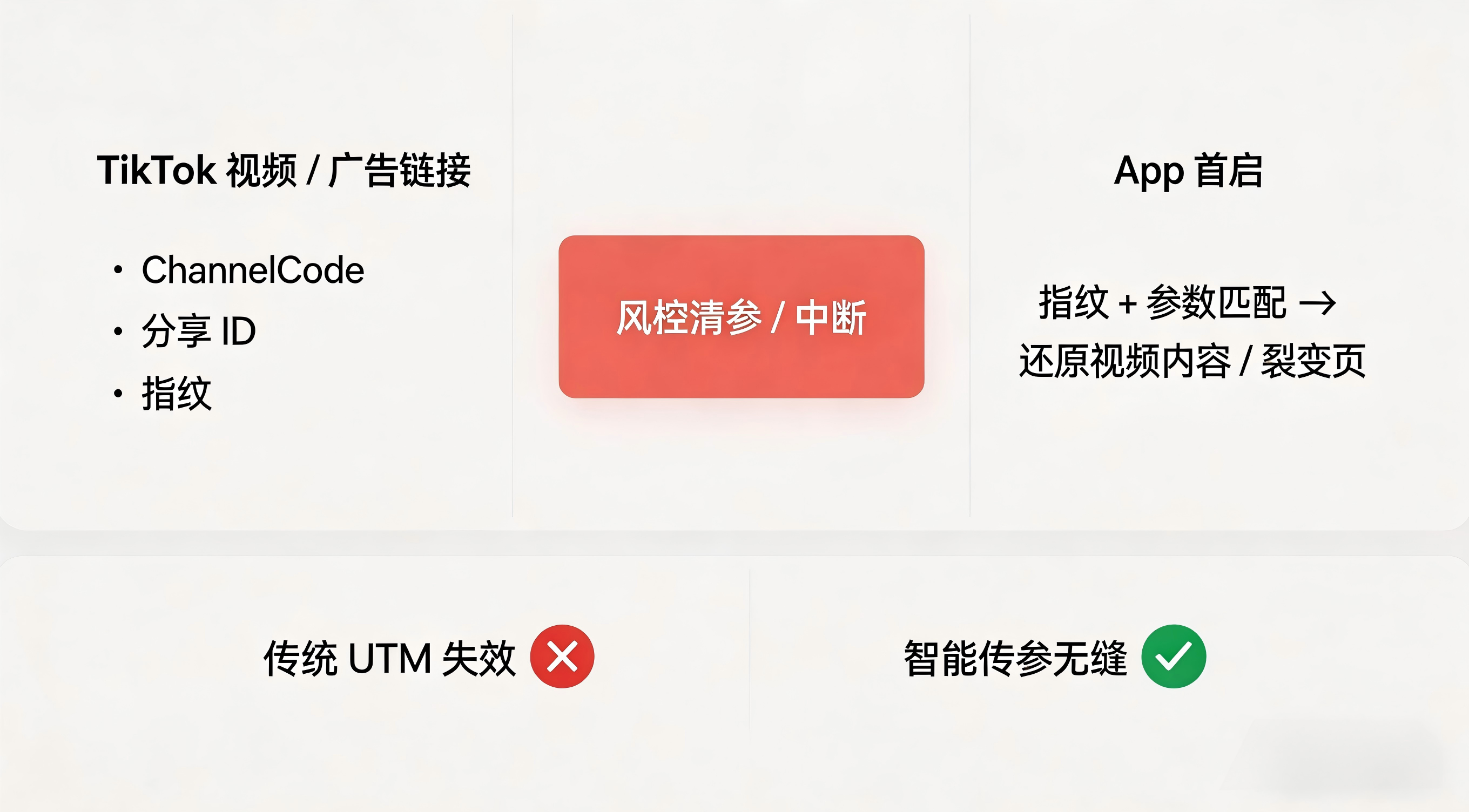 传统UTM或平台回调易失效(TikTok风控清参数),结果是增长团队只能粗放看“总安装”,无法按矩阵号、内容类型、分享入口拆解效果,投放优化全凭感觉。