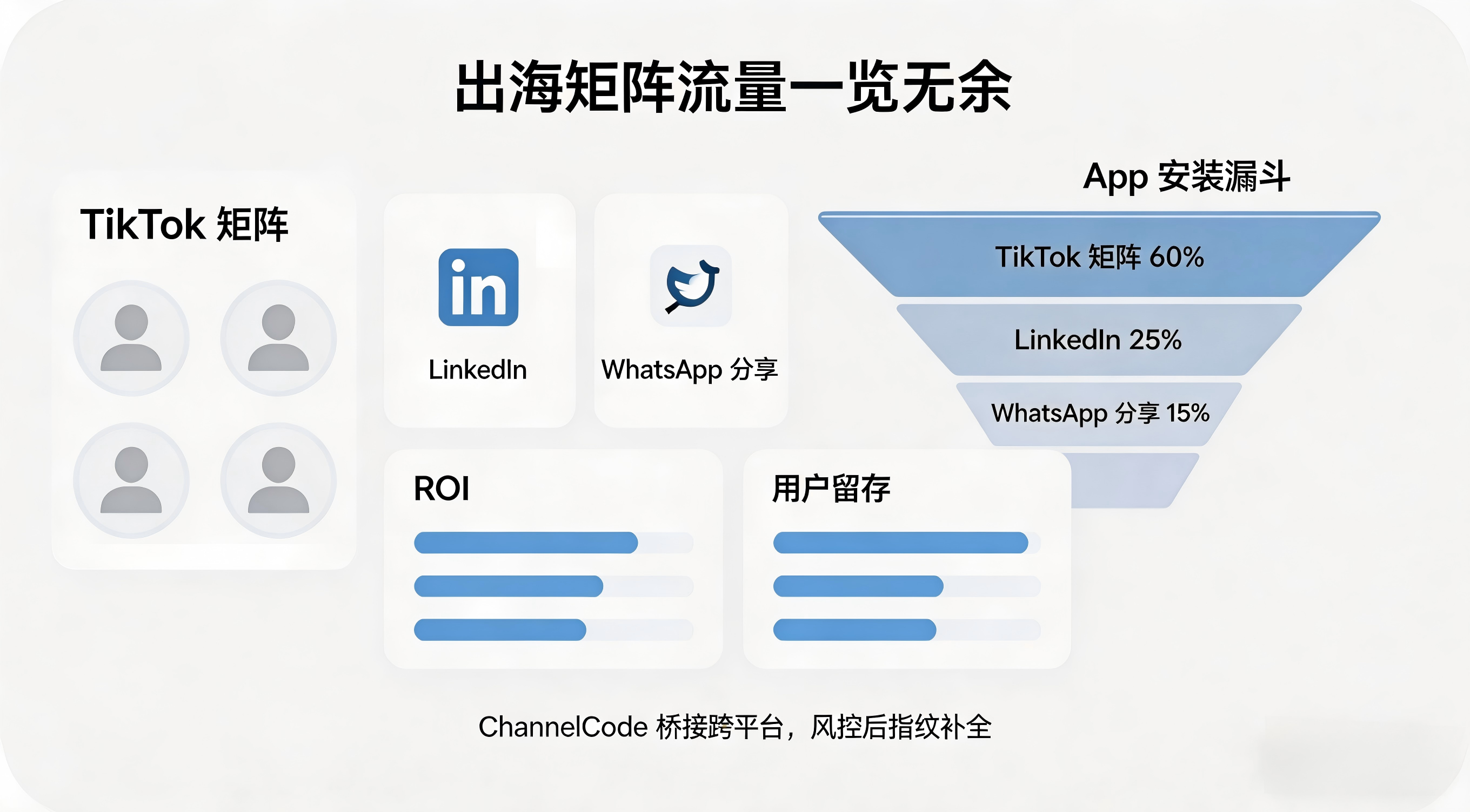 对出海App来说,这意味着:TikTok矩阵是高频裂变入口(曝光300万+、线索1000+),但风控+多渠道让流量路径碎片化,企业需一套机制,从矩阵号到App安装的全链路可视化,否则无法优化预算和内容策略。