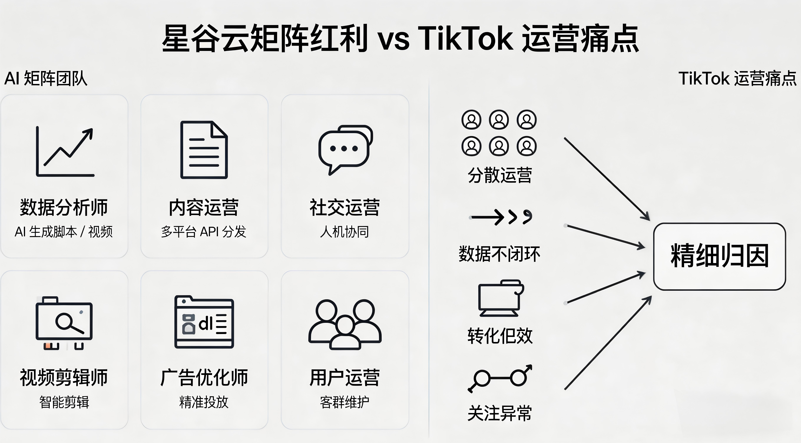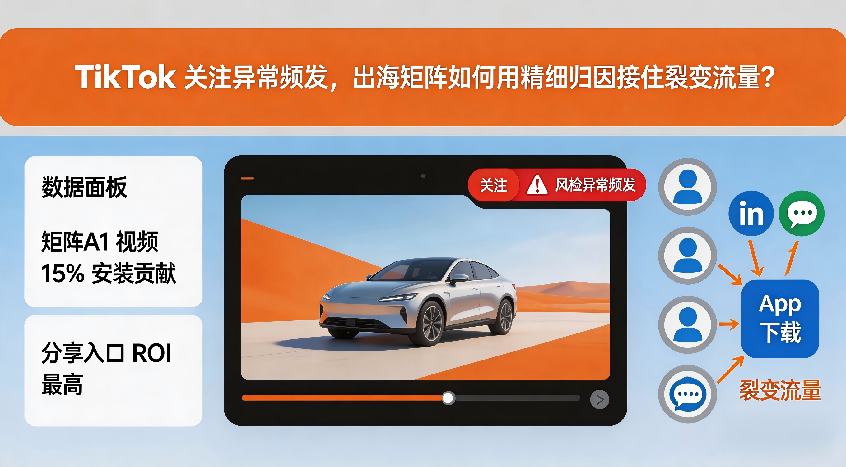 TikTok海外营销推广服务商星谷云等平台强调AI智能体矩阵能破解内容产能、本土化、多渠道管理痛点,但实际运营中,“关注不了别人”的风控异常频发已成为出海B2B企业的顽疾。对于矩阵式运营团队来说,这不只是账号问题,更是:怎么看清哪个号、哪个内容真正带来了App下载和转化?