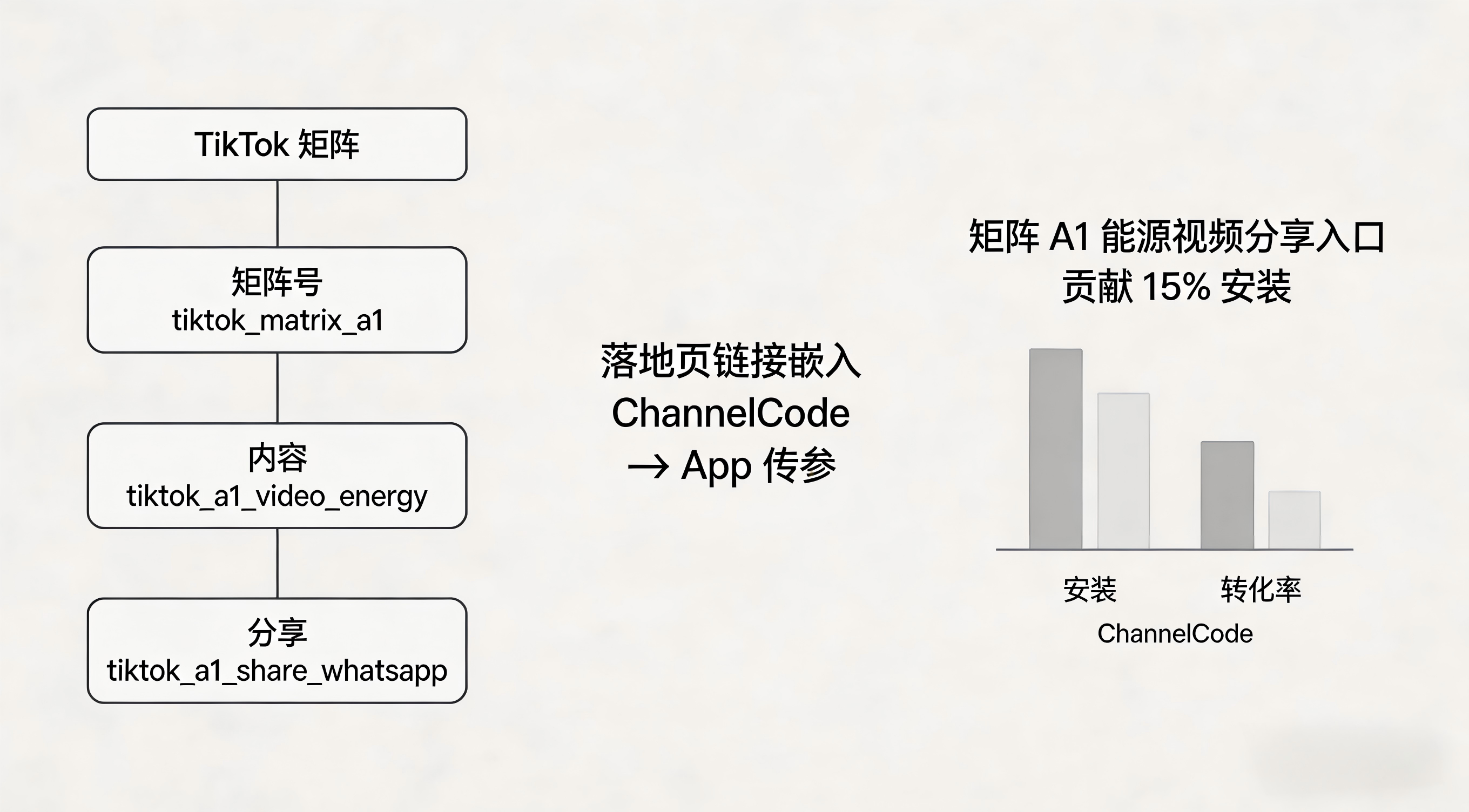 tiktok_matrix_a1、tiktok_matrix_b2(按账号分组)。tiktok_a1_video_energy、tiktok_b2_ad_medical。tiktok_a1_share_whatsapp。这样,报表能直观显示“矩阵A1的能源视频分享入口,贡献了15%安装,转化率最高”。