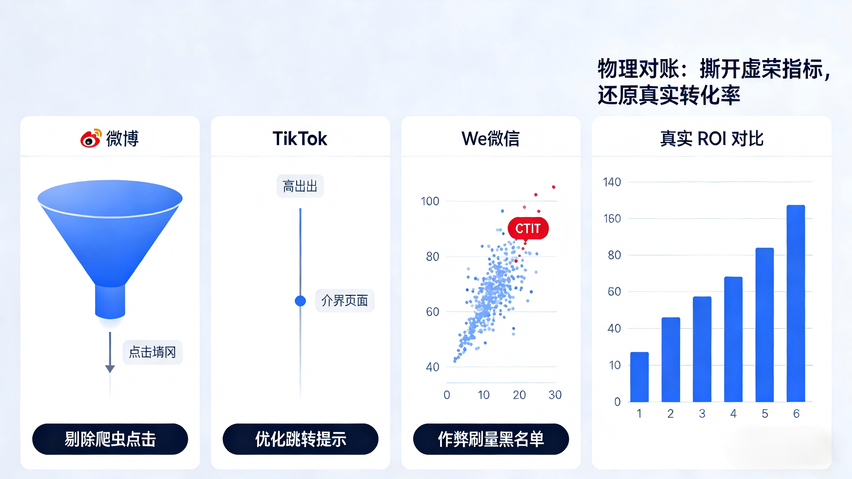 找到漏斗堵点后,团队迅速做出应对:剔除爬虫带来的无效点击以还原真实转化率基数;重写抖音端中转页的引导文案与交互按钮,显著降低了跳转流失;同时,在归因引擎中前置了异常 CTIT 和高频设备指纹的防刷黑名单。