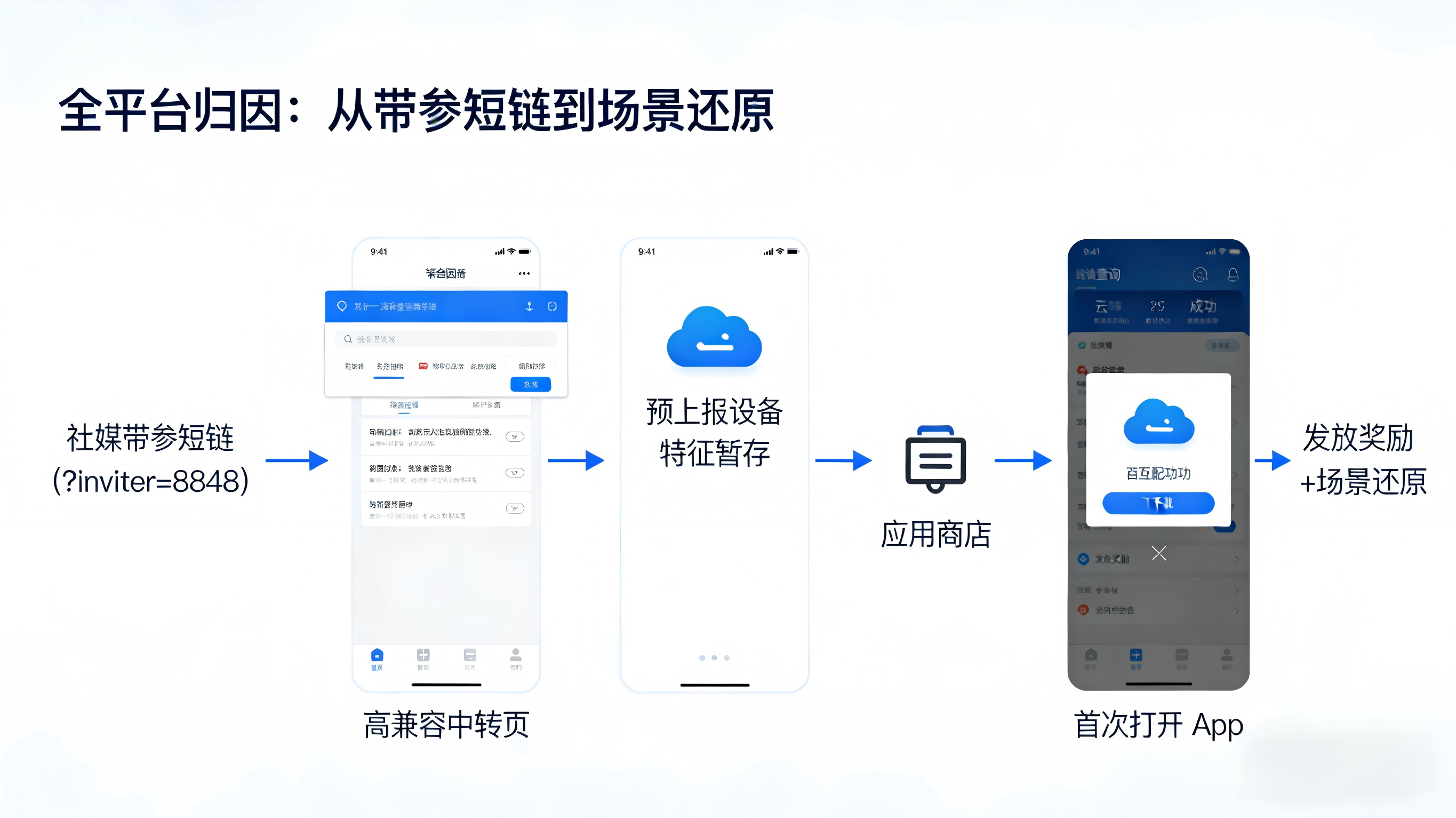 匹配成功后,云端会将之前的参数下发给 App。如此一来,系统不仅能精准确认该用户来自“微信”还是“抖音”,还能自动给分享者发放奖励,并直接将新用户引导至他当初在社媒上看到的那个具体活动页面。