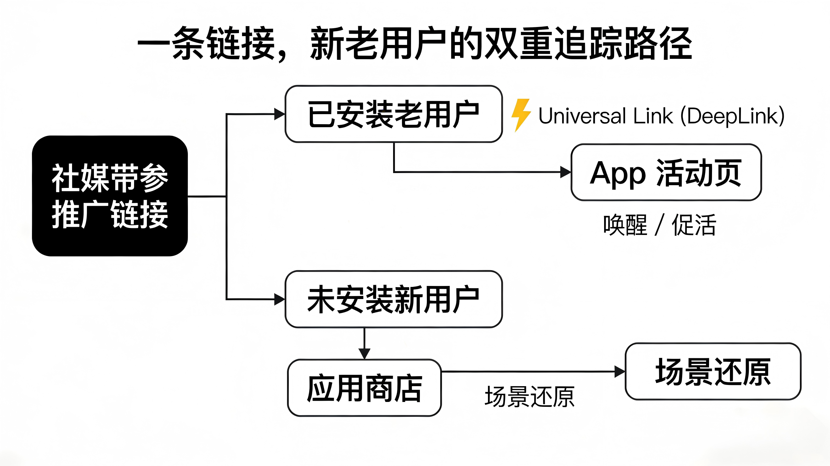 社交推广吸引来的往往是混合流量。对于已经安装了 App 的老用户,点击带参链接后,系统应利用 Universal Link 等深度链接技术直接唤起 App,并将该次点击计为“唤醒/促活”;对于未安装的新用户,则引导至商店下载,通过场景还原技术在首启时计入“新增/拉新”。一条链接,同时完成两类人群的精准分流与统计。