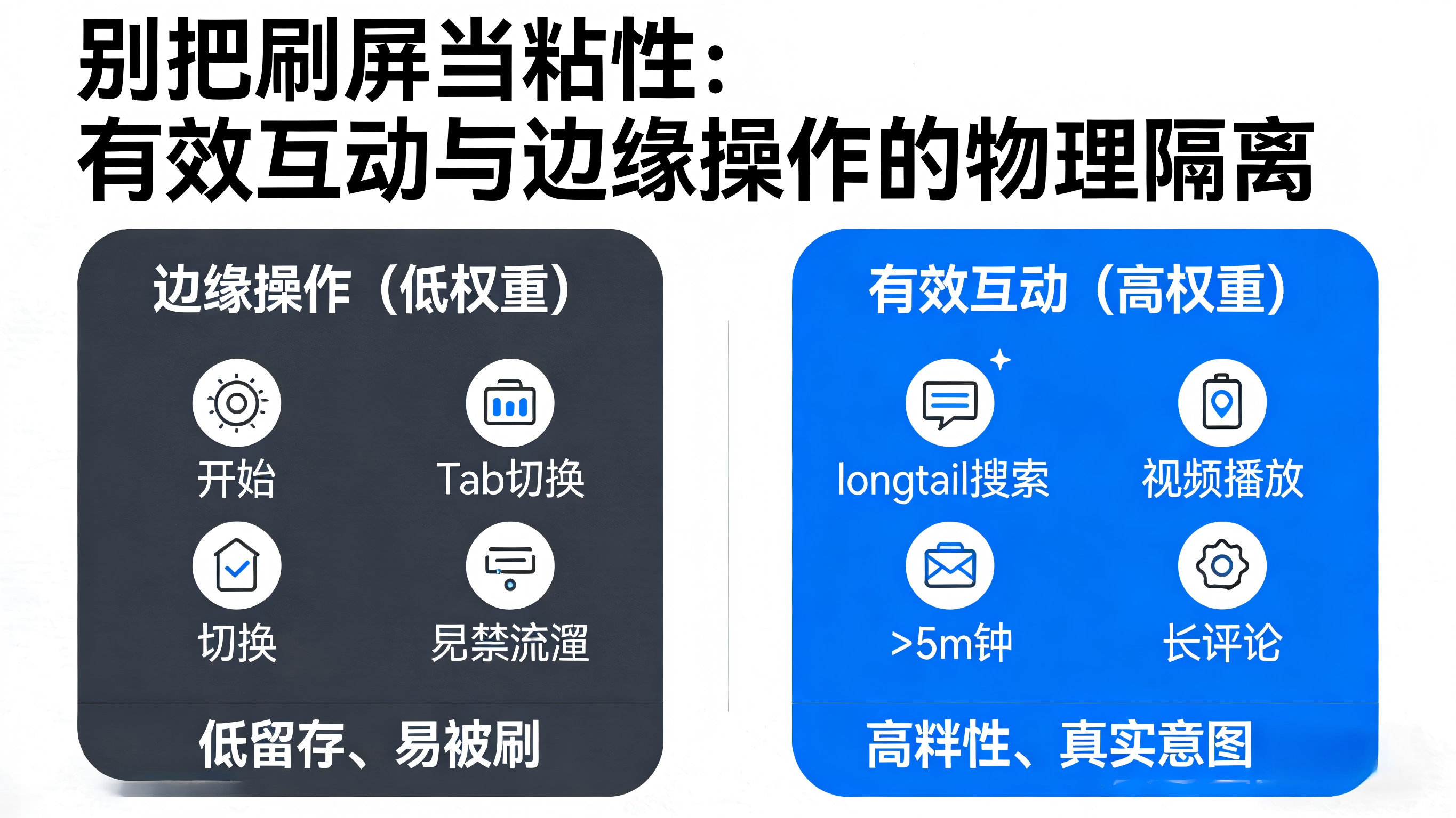 边缘操作是指用户为了维持应用基础运转或寻找目标而不得不做的动作,例如:冷启动加载、切换底部导航栏 Tab、关闭开屏广告、漫无目的地滑动屏幕等。而有效互动,则是真正贴合产品核心价值、能够反映用户真实意图的行为。例如,对于长视频产品而言,有效互动是“单次播放超过 5 分钟且无频繁拖拽”;对于电商类产品,是“使用长尾词主动搜索商品”或“加入购物车”;对于内容社区,则是“停留阅读完毕后发表字数大于 15 的评论”。当数据大盘的互动总量在涨,但“有效互动”占比持续走低时,往往预示着产品正在被劣质流量反噬。
