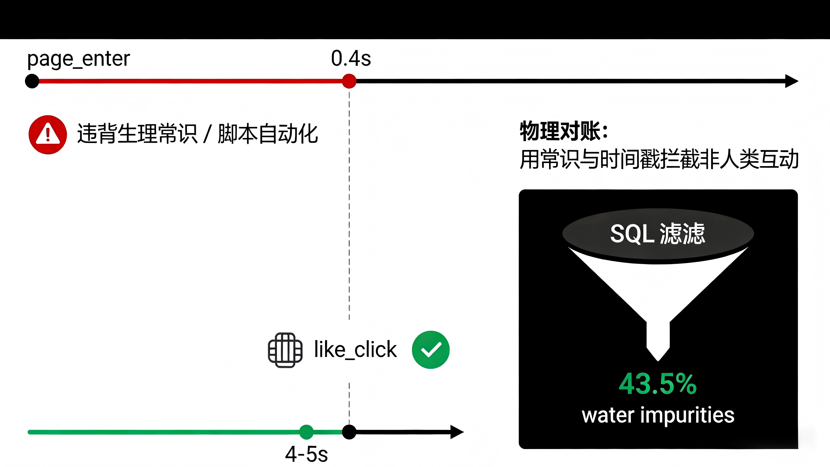 面对极度割裂的数据,研发与数据中心决定绕开聚合完毕的前端大盘,直接下沉到后端的埋点日志中,抓取用户行为的时间戳进行对账。他们引入了一个极其核心的校验维度:物理与生理现实约束。