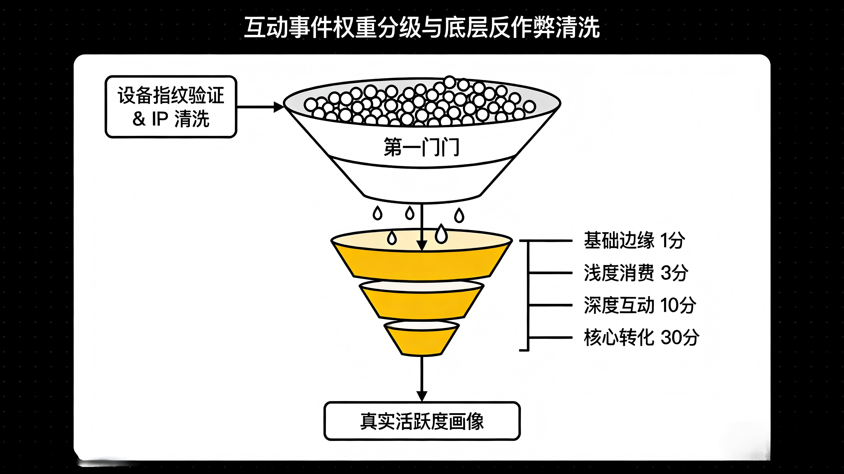 通过给每个用户每天的所有行为计算“加权总分”,我们就能在后台直观地拉出一份“真实活跃度分布图”,将那些总分极低但请求次数极高的羊毛党筛选出来。