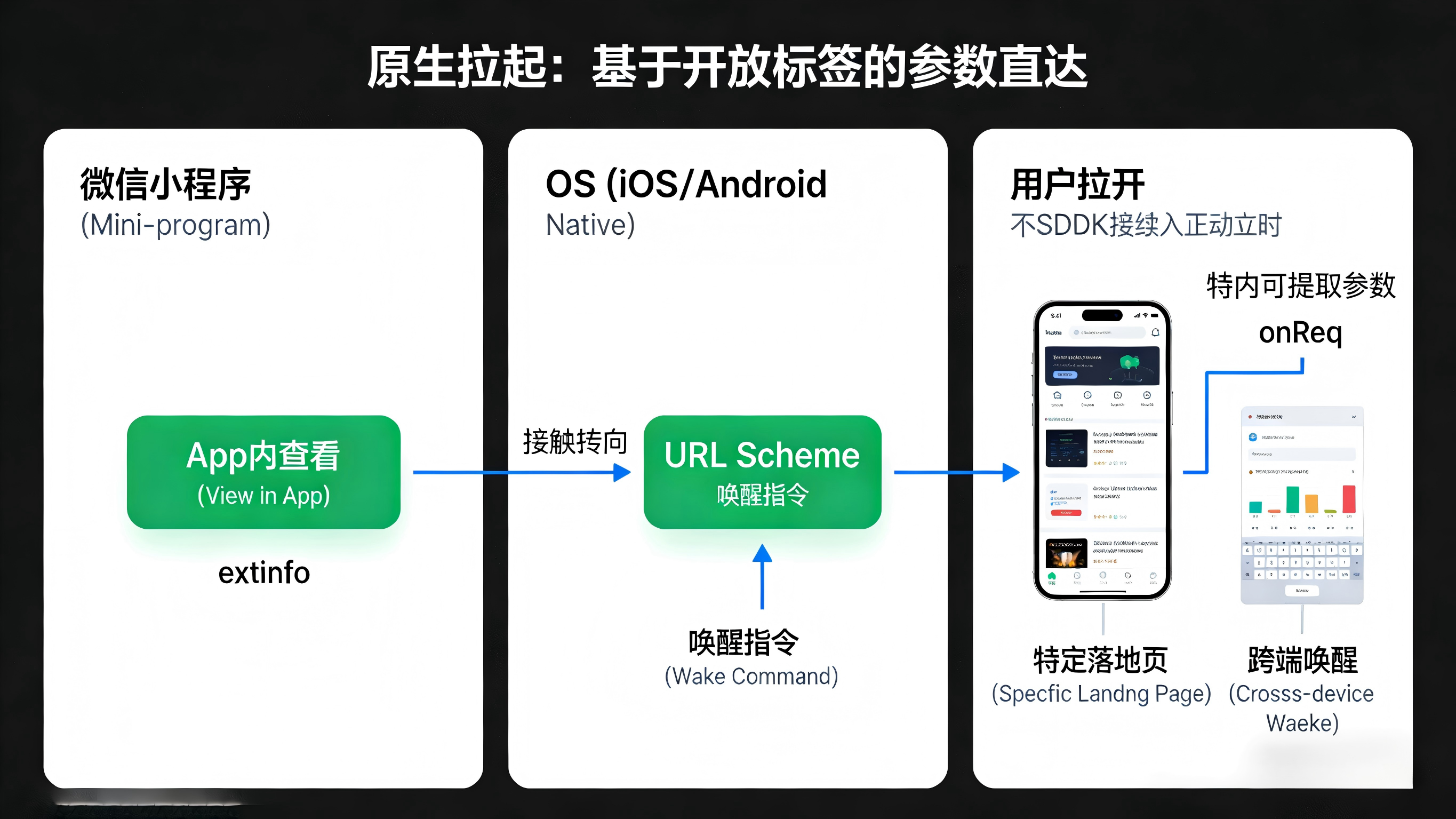 对于“手机上已经安装了该 App”的老用户,唤醒并追踪相对直接。微信官方提供了 wx-open-launch-app 等开放标签,允许满足条件的小程序直接拉起 App。在技术实现上,开发者需要动态生成带有专属参数的 URL Scheme。当用户点击按钮时,这些参数(例如引流活动 ID、分享者的 User ID、特定的商品落地页路径等)会作为扩展字段一并传递给系统。App 被唤醒后,原生系统(iOS 或 Android)会拦截到这个 Scheme,并由客户端内置的 SDK 解析提取出对应参数,瞬间将用户导航至对应的 App 内活动页,同时在后台上报一次完美的“跨端唤醒与归因”事件。