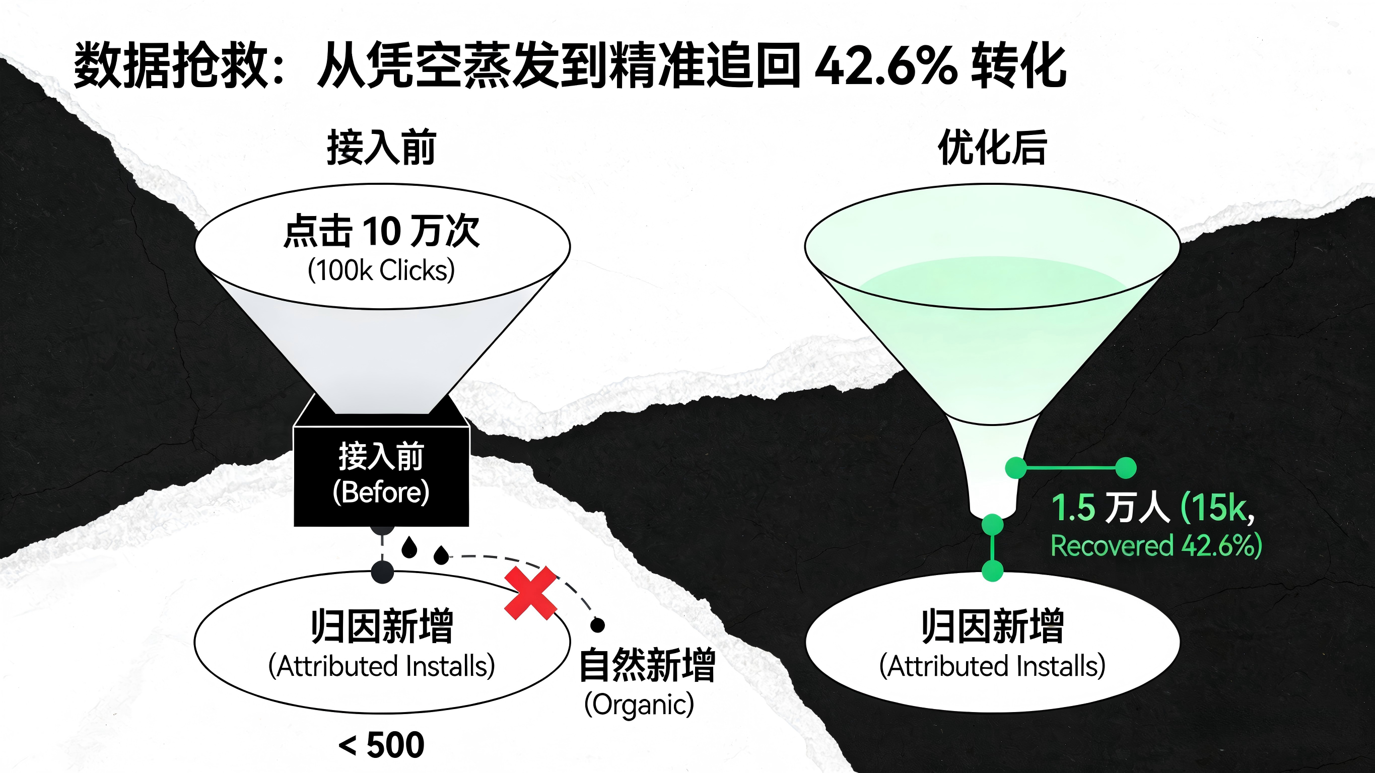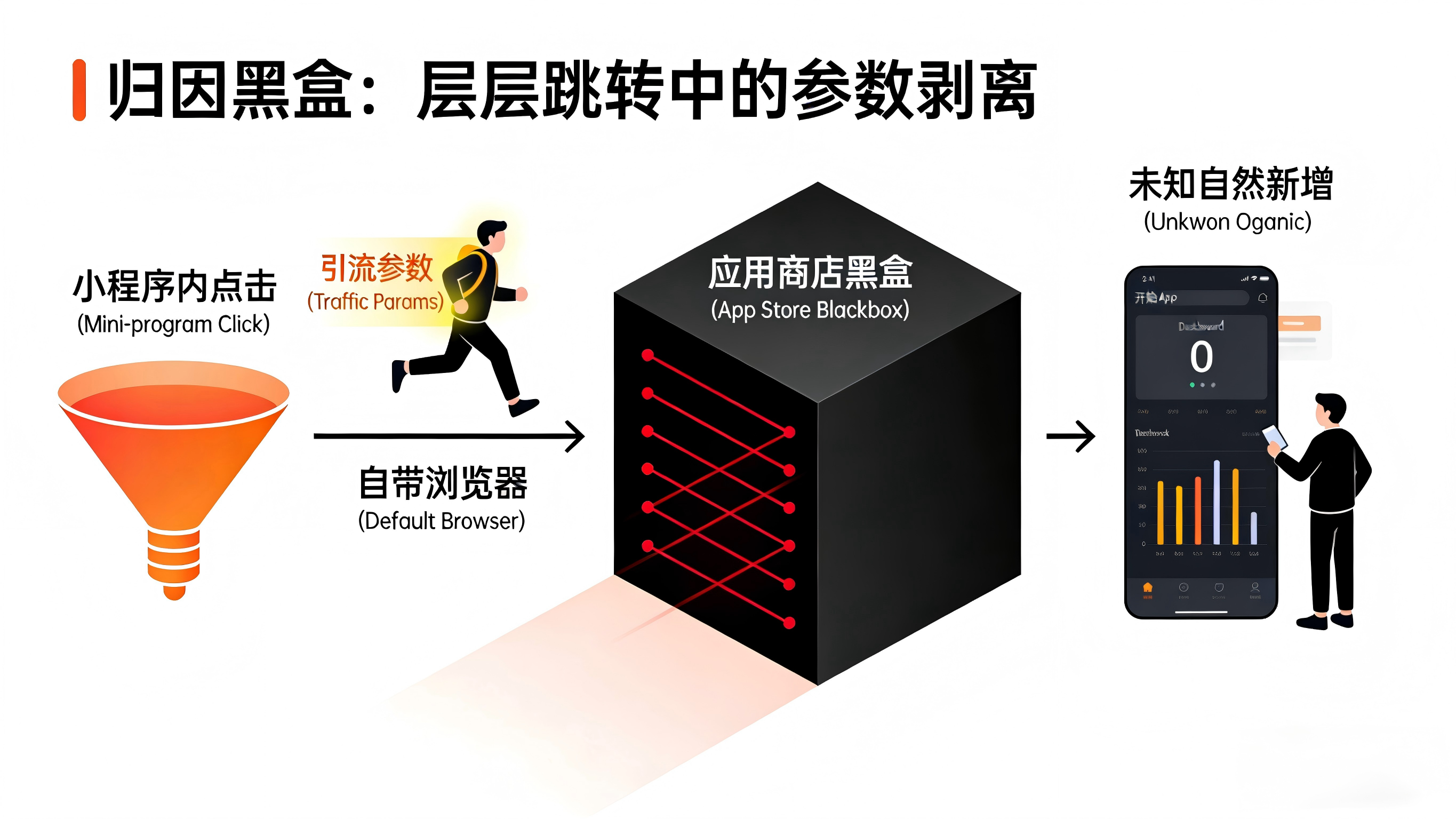 经过链路逐层抓包与重构分析,团队找到了元凶:原有的小程序跳转采用的是极其原始的静态下载链接。当未安装用户被引导至自带浏览器并最终前往应用商店时,所有的 URL 参数被彻底抹除。App 端的统计逻辑因为接收不到任何参数,便理所当然地将这些历经千辛万苦下载激活的用户,全部误判为了“商店自然流量”。
