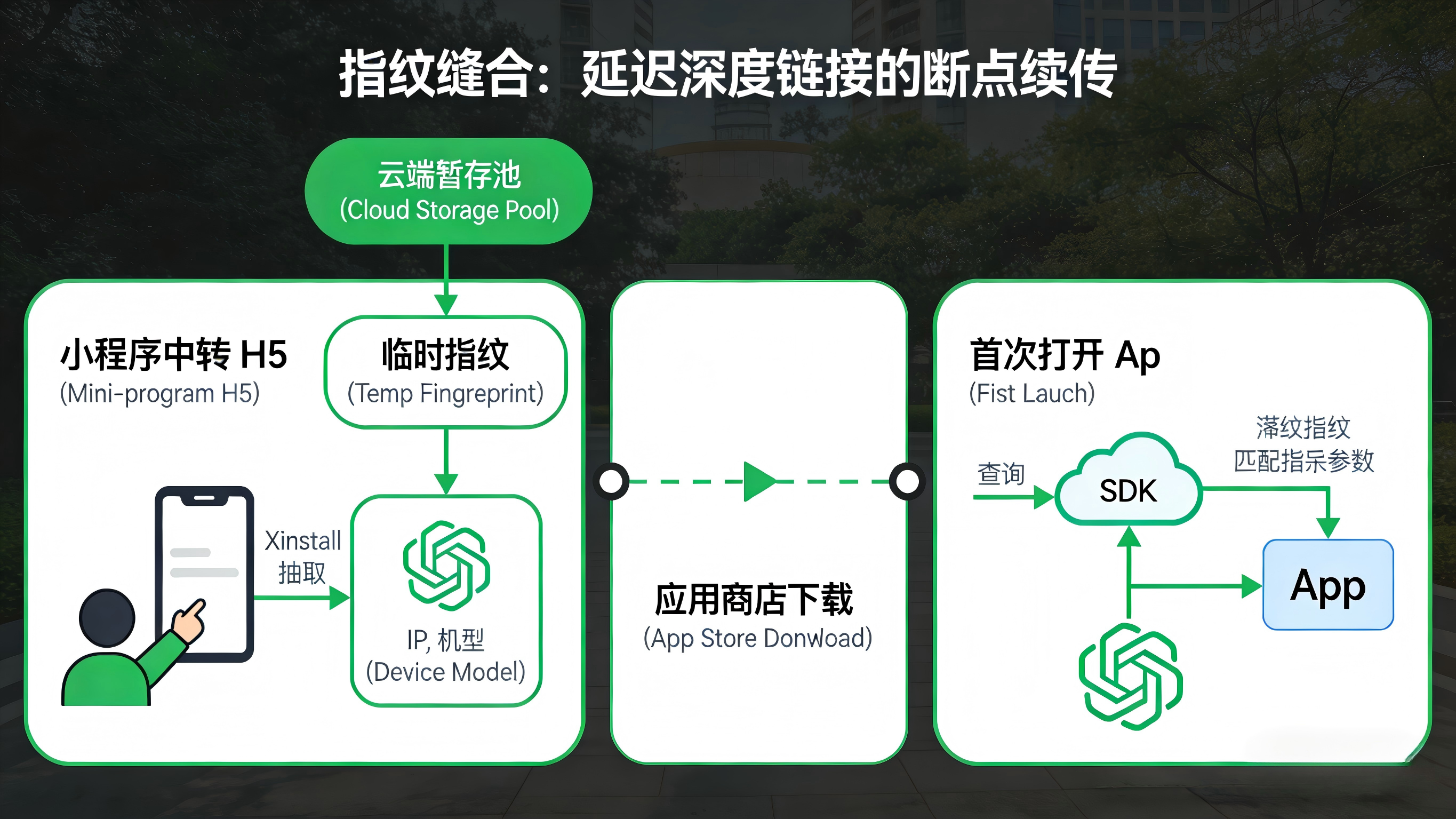 当用户未安装 App,直接跳转会失败。标准的统计方案是在小程序内先跳转到一个中转落地页(H5)。在这个页面上,系统静默采集当前用户的网络与设备环境特征生成点击指纹,随后页面提示用户点击前往应用商店下载。当用户下载完成并首次打开 App 时,内置的 SDK 会再次采集特征并向云端发起比对。一旦特征吻合,云端就会将落地页上的推广参数下发给 App,从而精准记录这是一次由小程序引导产生的新增下载。