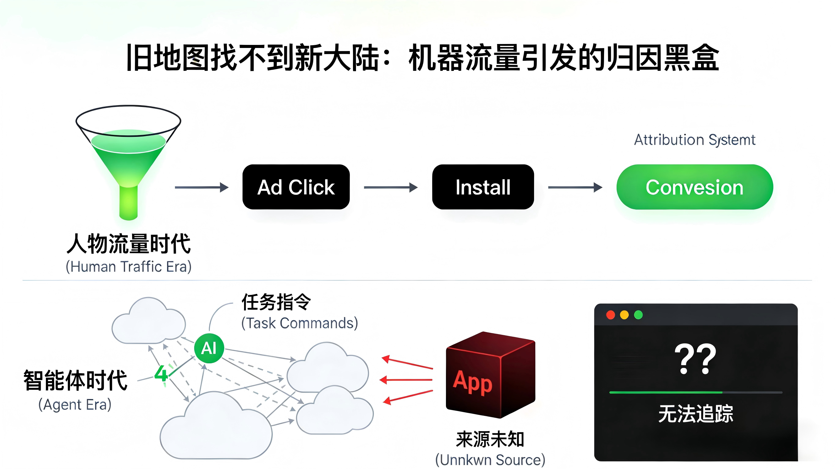 在传统的页面分发时代,用户的转化路径是可视化的:点击广告、浏览落地页、跳转应用商店、下载并打开 App。团队依靠渠道包或单一的设备指纹就能基本看清流量来源。然而,在“龙虾”这类 AI 智能体主导的场景中,大量的访问请求变成了机器自动发起的“任务流量”。