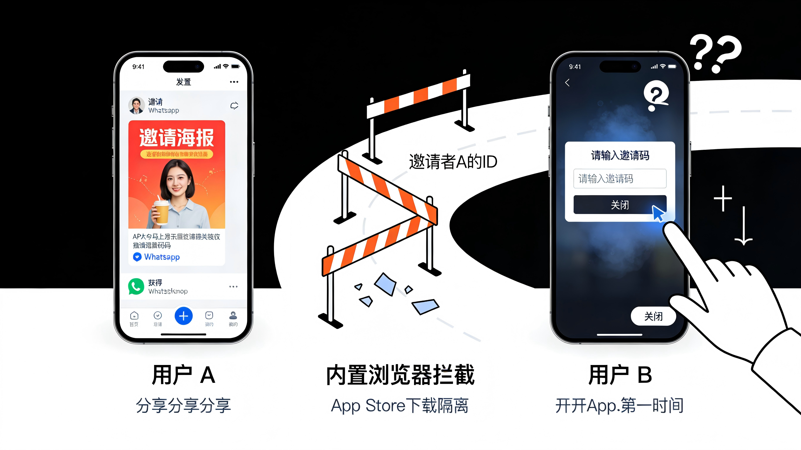 结果就是,用户 B 打开 App 时不仅看不到活动页面,还必须手动输入冗长的邀请码;同时,增长团队也无法准确统计这次成功的拉新应该归功于哪个老用户、哪条私域渠道。这种因为参数丢失导致的体验摩擦,往往会让裂变活动的转化率折损一半以上。