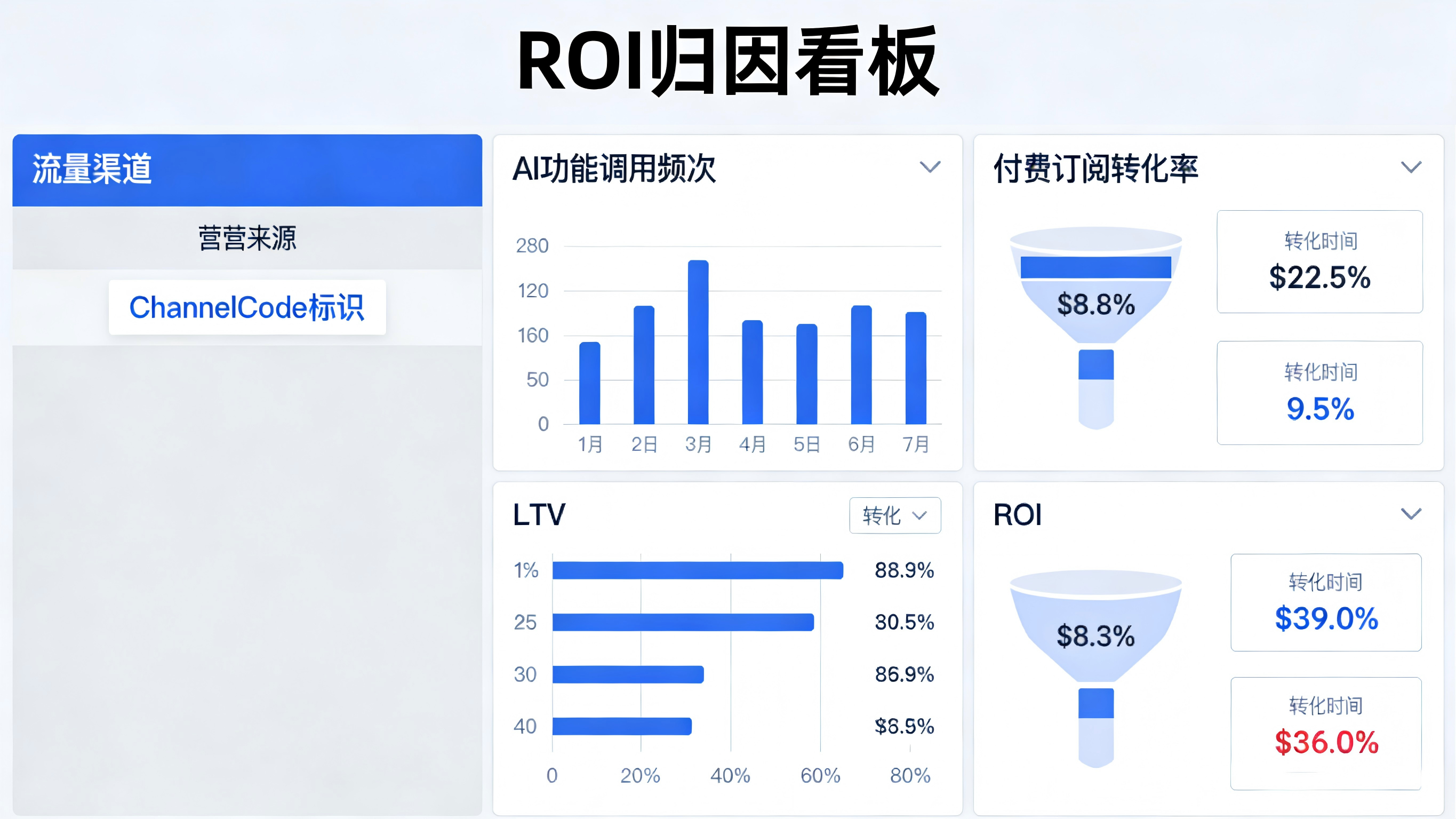 AI 团队需要放弃盲目的买量,转向基于数据验证的精细化运营。通过为每一个外链、海报或 KOL 生成独立的渠道编号(ChannelCode),底层系统可以利用设备环境特征进行高精度模糊匹配。无需人工打标,后台就能自动统计出每个渠道的展示、点击、安装、注册乃至最终付费订阅(ROI)情况,让每一分买量预算都花在刀刃上。