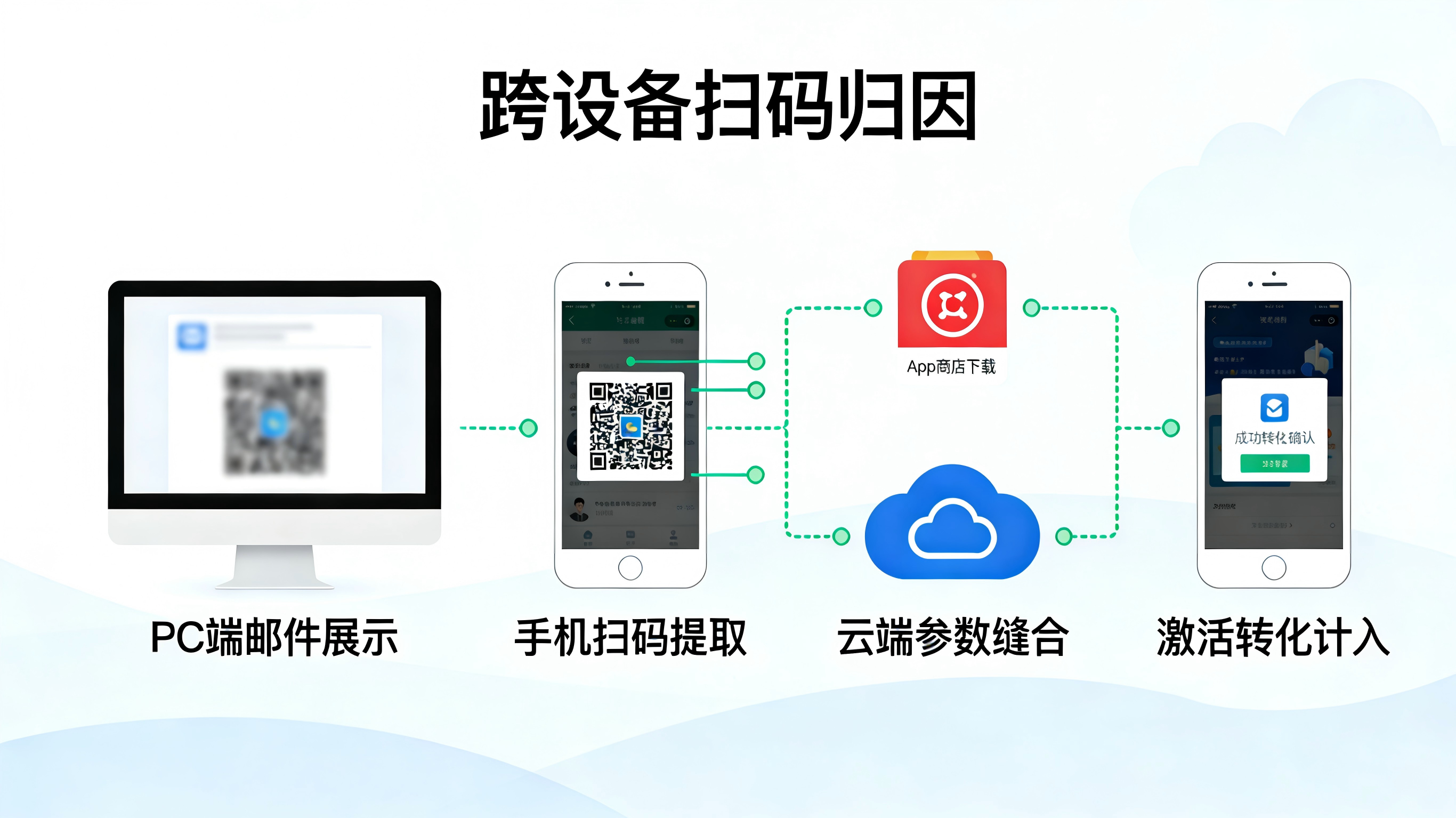 针对痛点最深的 PC 端邮件查看场景,最有效的跨设备统计方案是在邮件的显眼位置嵌入“专属动态二维码”。不要让用户去应用商店自己搜索,而是通过文案引导他们直接用手机扫码。在手机扫码的瞬间,系统就已经在云端采集了手机的设备特征,并将其与这封邮件的推广参数进行了云端缝合,从而彻底打通了“PC 浏览 - 手机下载”的数据盲区。
