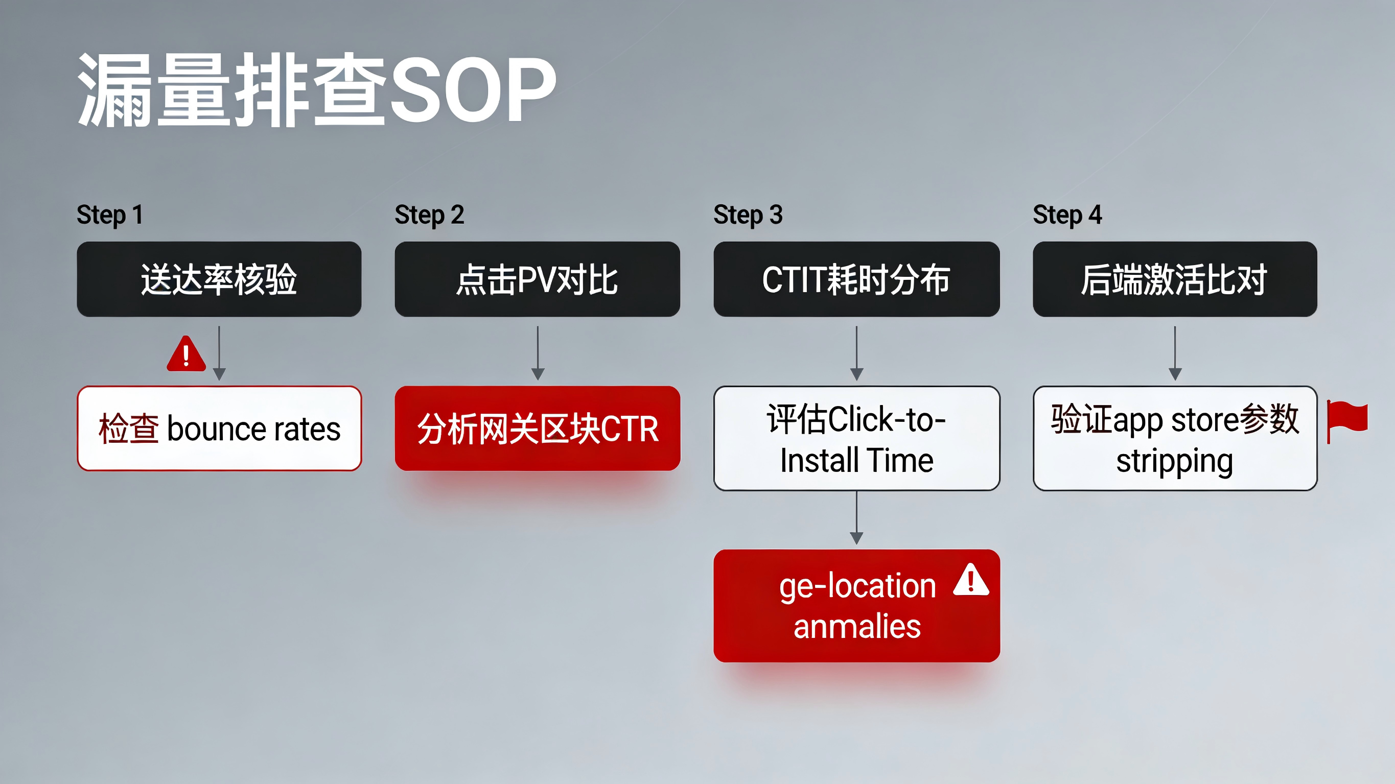 排障的第一步是确认前端物理链路。首先在邮件发送平台确认真实的邮件送达率(Delivery Rate)与点击率(CTR),排除因进入海外垃圾邮件箱或被服务商拦截导致的前置流失。只有当确认前端点击数(PV/UV)足够庞大且无误后,再将其与归因后台的“落地页到达数”进行比对,定位流失发生在哪一层。