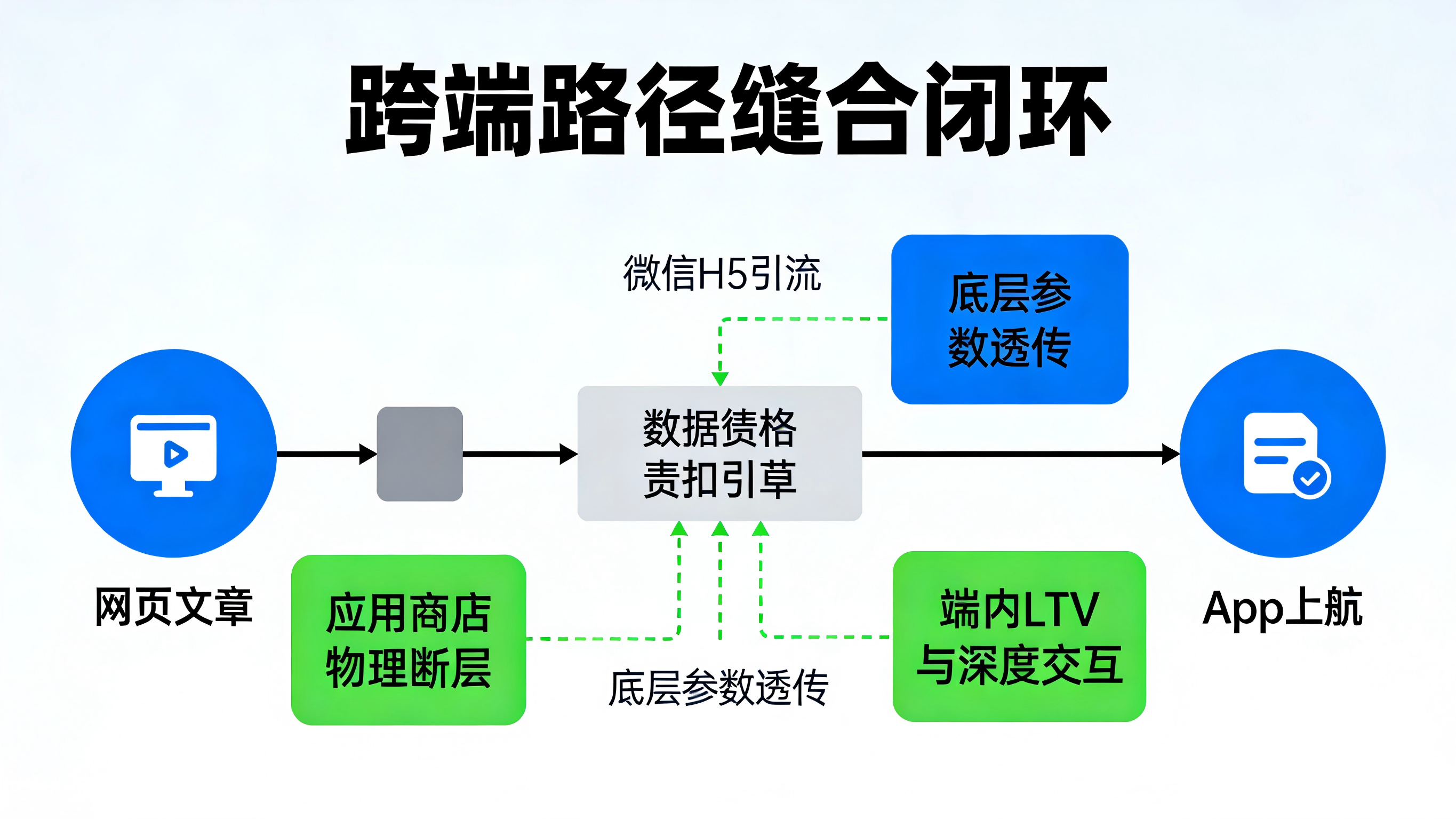现代移动端路径分析中最棘手的问题,往往发生在跨端跳转场景上。当一个用户在微信里看了一篇爆款 H5 文章,点击底部的“下载 App”并跳入各大应用商店后,用户的行为路径在传统的 Web 统计和 App 端内统计中就彻底断成了两截。普通的路径探索工具无法将这两段跨越了生态壁垒的独立会话(Session)合二为一。