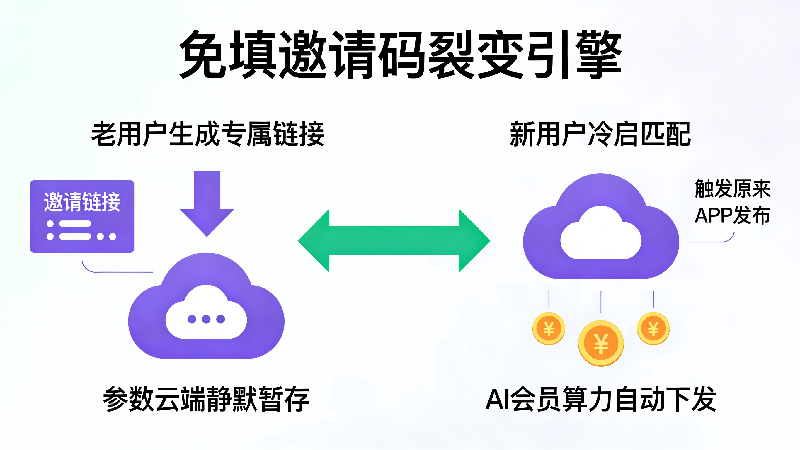 传统的“复制邀请码”操作常常导致裂变中断。利用智能传参技术,老用户将 App 链接分享到微信或 WhatsApp,新用户点击下载后首次打开 App 时,系统自动在底层匹配参数,实现免填邀请码,瞬间完成师徒绑定与会员时长下发。这极大缩短了冷启动漏斗,提升了裂变活动的真实留存率。