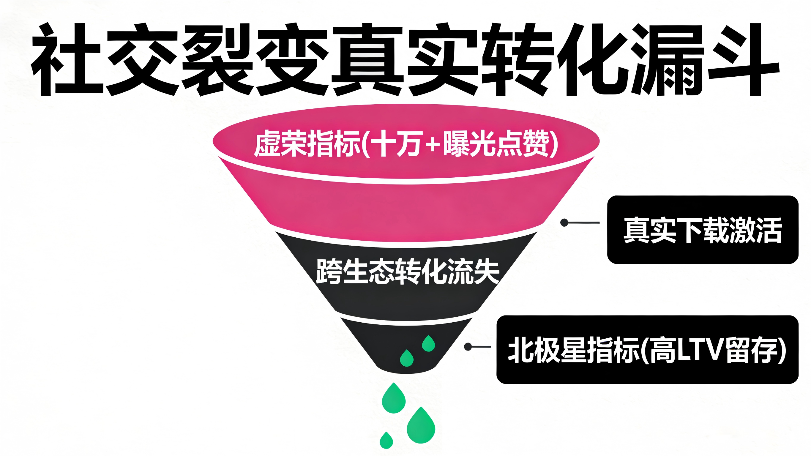 在业务实战中,常常出现数据报表上“繁花似锦”,但实际业务却停滞不前的窘境。一条在微信或微博上获得万次转发的活动推文,如果由于落地页跳转不畅或缺乏真实的下载动机,可能连一百个真实的注册都带不来。只看前端传播量,不看最终向原生 App 输送的归因转化量,是传统社交效果分析的致命伤。真正的分析必须穿透“点赞转发”,将目光锁定在“点击-下载-激活”的核心漏斗上。