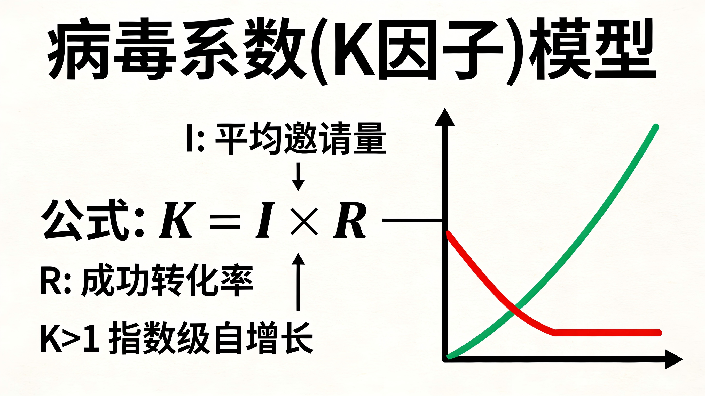 K因子(K-Factor)是衡量产品能否实现病毒式自增长的终极指标。其计算公式为:K = I × R。其中,“I”代表每个现有用户发送的平均邀请数量(分享意愿),“R”代表这些邀请最终成功转化为新用户的比率(转化效率)。当 K > 1 时,意味着每一个老用户都能带来超过一个新用户,产品即进入自发性的指数级病毒爆发状态;当 K < 1 时,则说明裂变带来的新增无法覆盖用户的自然流失,必须依靠外部买量来维持生命力。