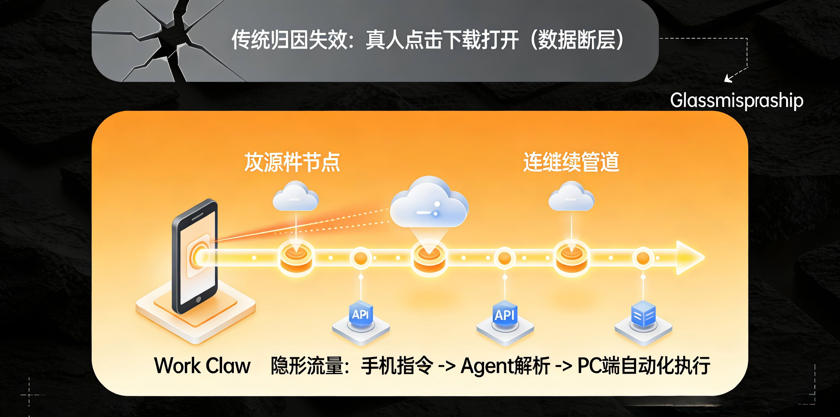 在这个“手机下达指令 -> 云端/本地 Agent 解析 -> PC端执行任务 -> 调取办公软件接口 -> 完成分享”的链路中,传统基于“点击-下载-打开”的页面统计逻辑彻底失效了。因为办公 App 被唤醒和使用时,屏幕前可能根本没有“真人”在点击。