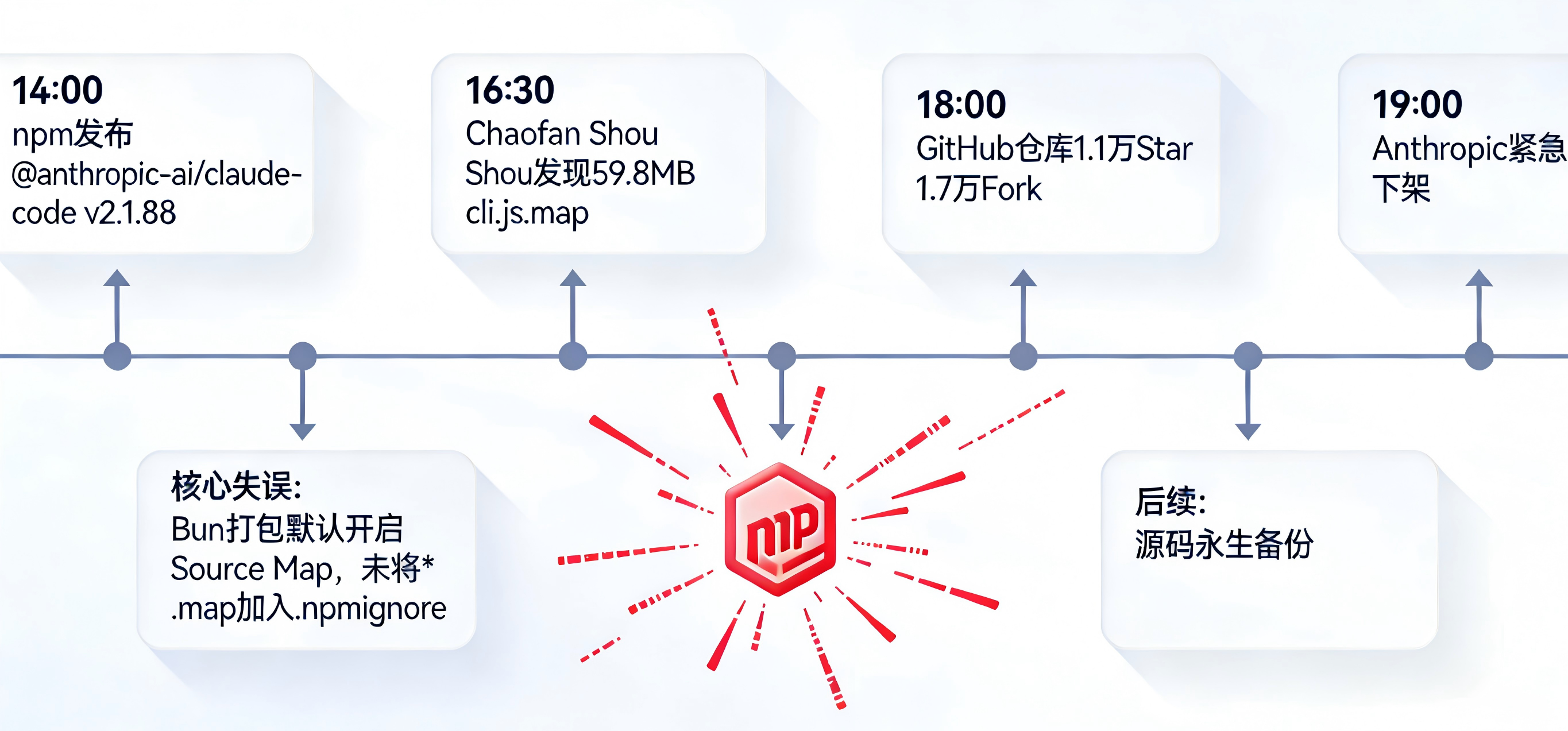 事发时间线清晰而迅猛。3月31日14:00左右,Anthropic在npm发布@anthropic-ai/claude-code v2.1.88版本。16:30,安全研究员Chaofan Shou(@Fried_rice)在检查npm包时,发现包里多了一个59.8MB的cli.js.map文件。通过Source Map,他直接还原出1900+个源文件、51.2万行未混淆的完整TypeScript代码,并在X平台曝光。18:00,源码被迅速归档到GitHub,首个仓库1小时内收获1.1万Star、1.7万Fork,全网疯传。19:00,Anthropic紧急下架问题版本,但为时已晚——源码已被无数次备份,彻底“永生”。