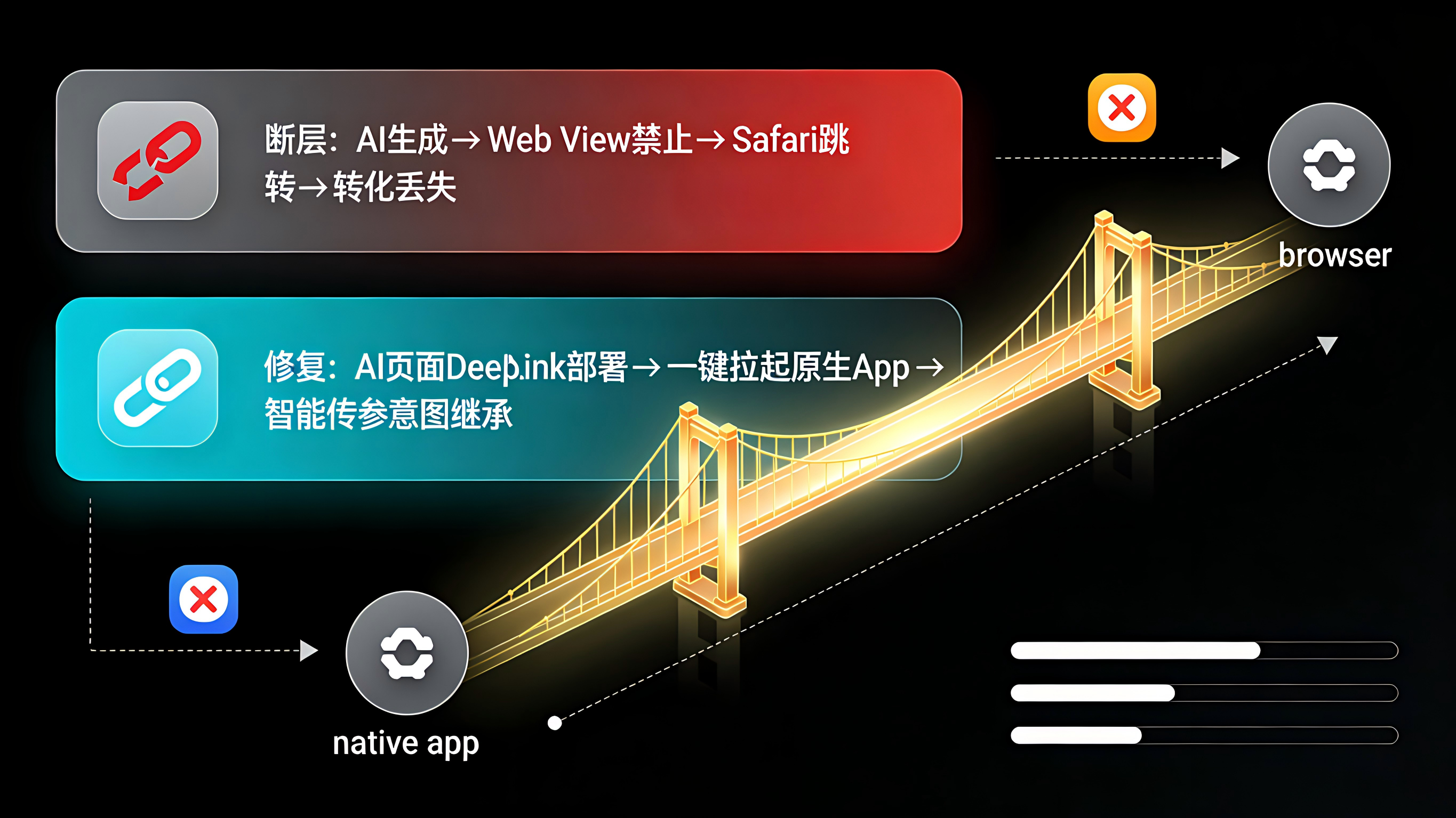 这意味着原本在一个 App 内可以完成的“生成-预览-使用-转化”链路,被硬生生切断了。当用户在外部浏览器中点击一个 AI 生成的交互页面,试图下载或唤起你的主营 App 时,传统的埋点和追踪代码在跨越 App 到 Safari 的瞬间就已经失效。