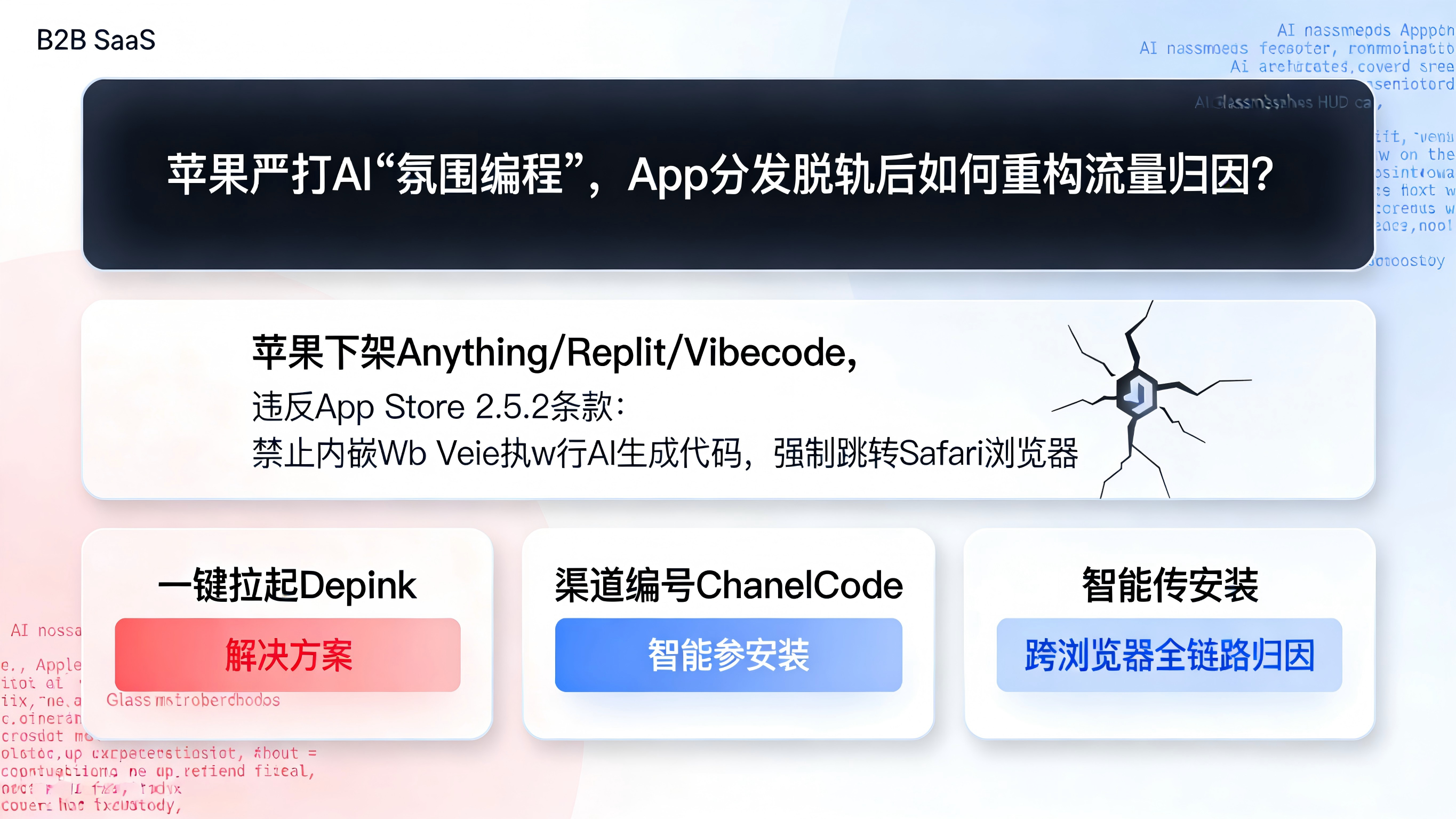 近日,苹果以违反审核规则为由,强势介入并限制了 Replit、Vibecode 以及 Anything 等多款主打 AI“氛围编程(Vibe Coding)”的应用,甚至将部分产品直接从 App Store 下架。这场看似只是“平台与开发者”的常规博弈,实则撕开了 AI 时代应用分发生态的巨大裂口:当 AI Agent 具备了随时随地生成、运行并分发“微应用”的能力,传统的 App 分发模式与基于系统的底层追踪逻辑,正面临断崖式的断层。对于 App 开发者与增长团队而言,必须重新审视:当流量的入口被系统强制改变,我们该如何接住这些散落的隐形流量?