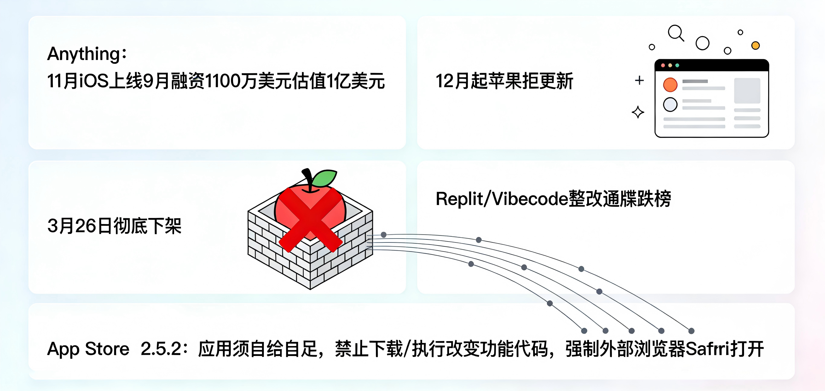 苹果对 Anything 和 Replit 等氛围编程工具的铁腕治理,表面上是维护应用商店规则,实际上是移动互联网旧秩序对 AI 生产力新范式的一次被动防御。当“代码生成”变得像打字一样简单,中心化的应用分发渠道注定会被海量的碎片化、自动化应用所瓦解。
