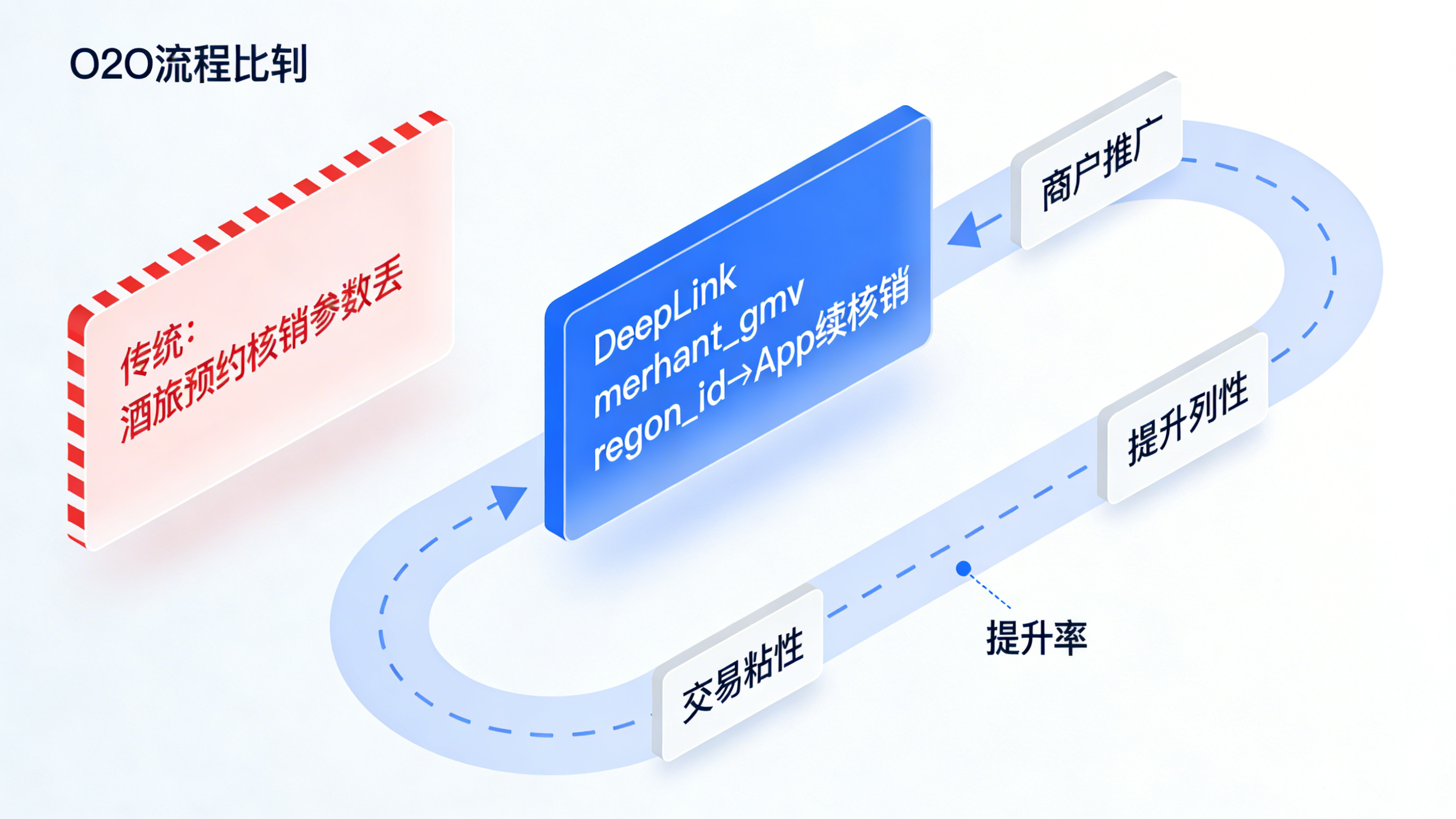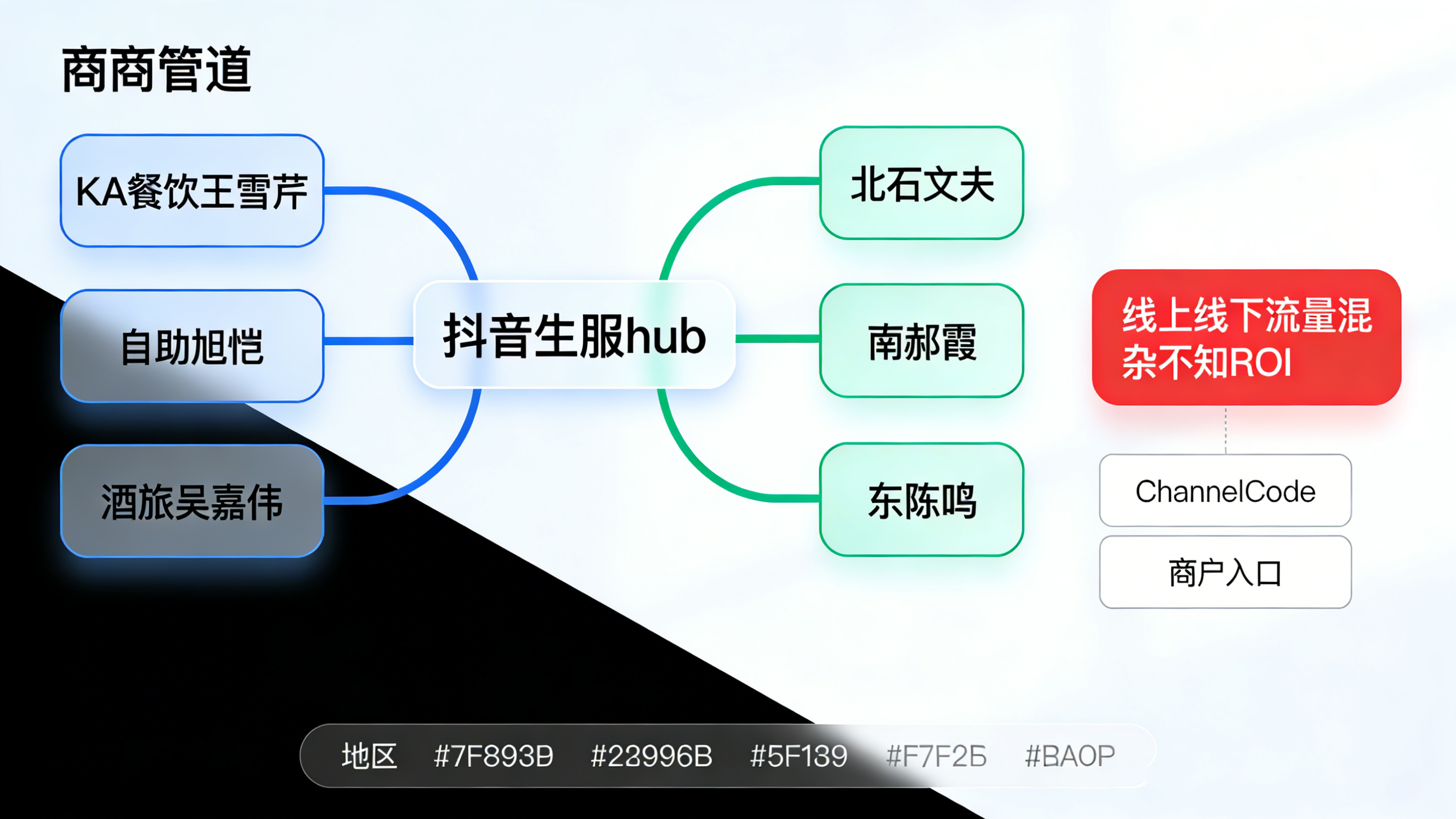 商户分发双轨:线上KA精准/线下小店地推,流量混杂不知ROI;酒旅全链(预约/核销)参数丢中断;区域渗透,O2O门店数据断。