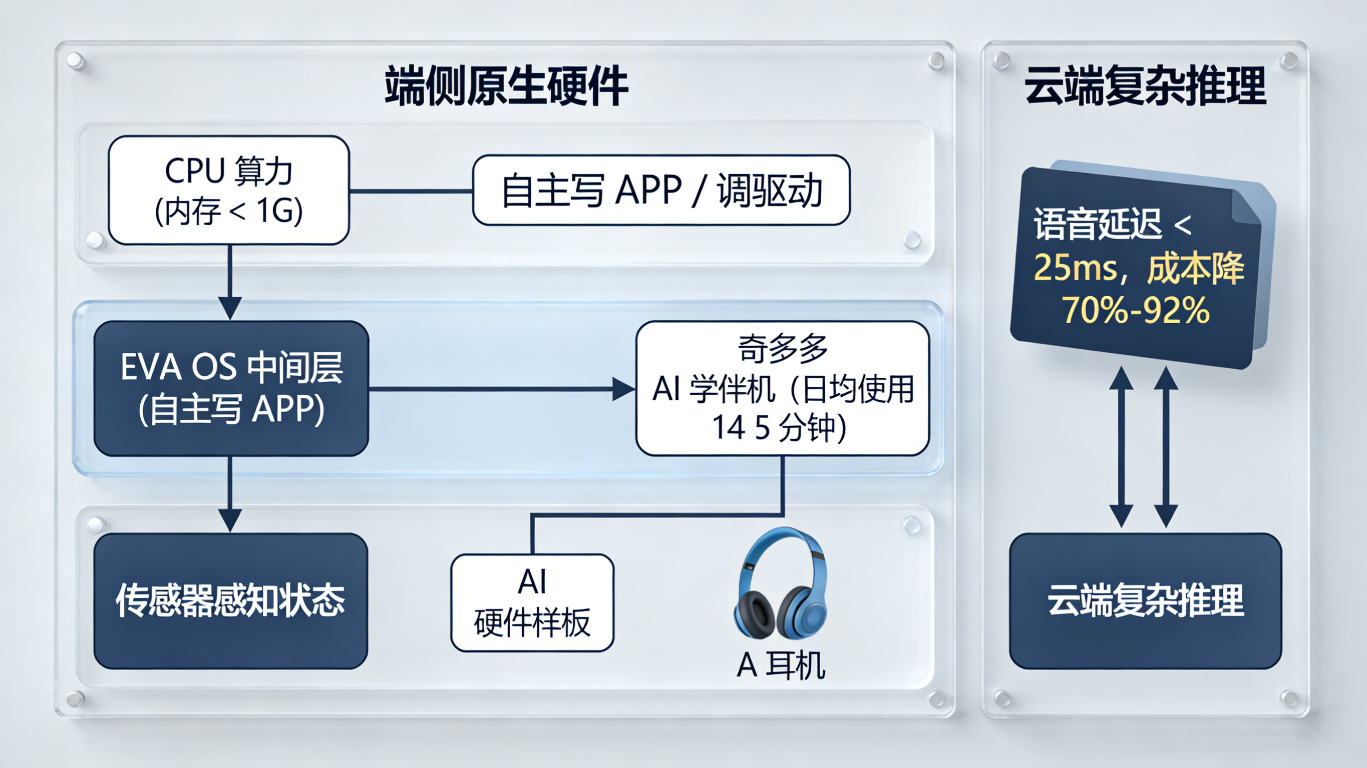 EVA OS作为中间层,让AI感知芯片算力、传感器状态,自主调驱动写APP;端云协同,端侧主导感知交互,云端复杂推理。