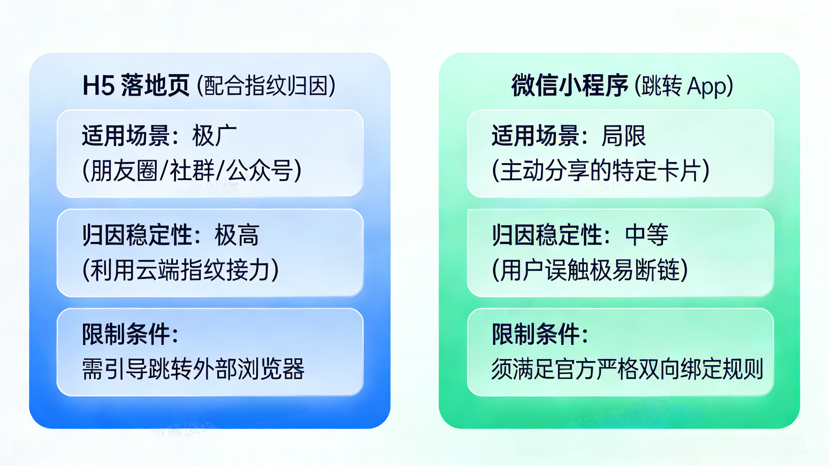 | 维度 | H5 落地页(配合指纹归因) | 微信小程序(跳转 App) |
