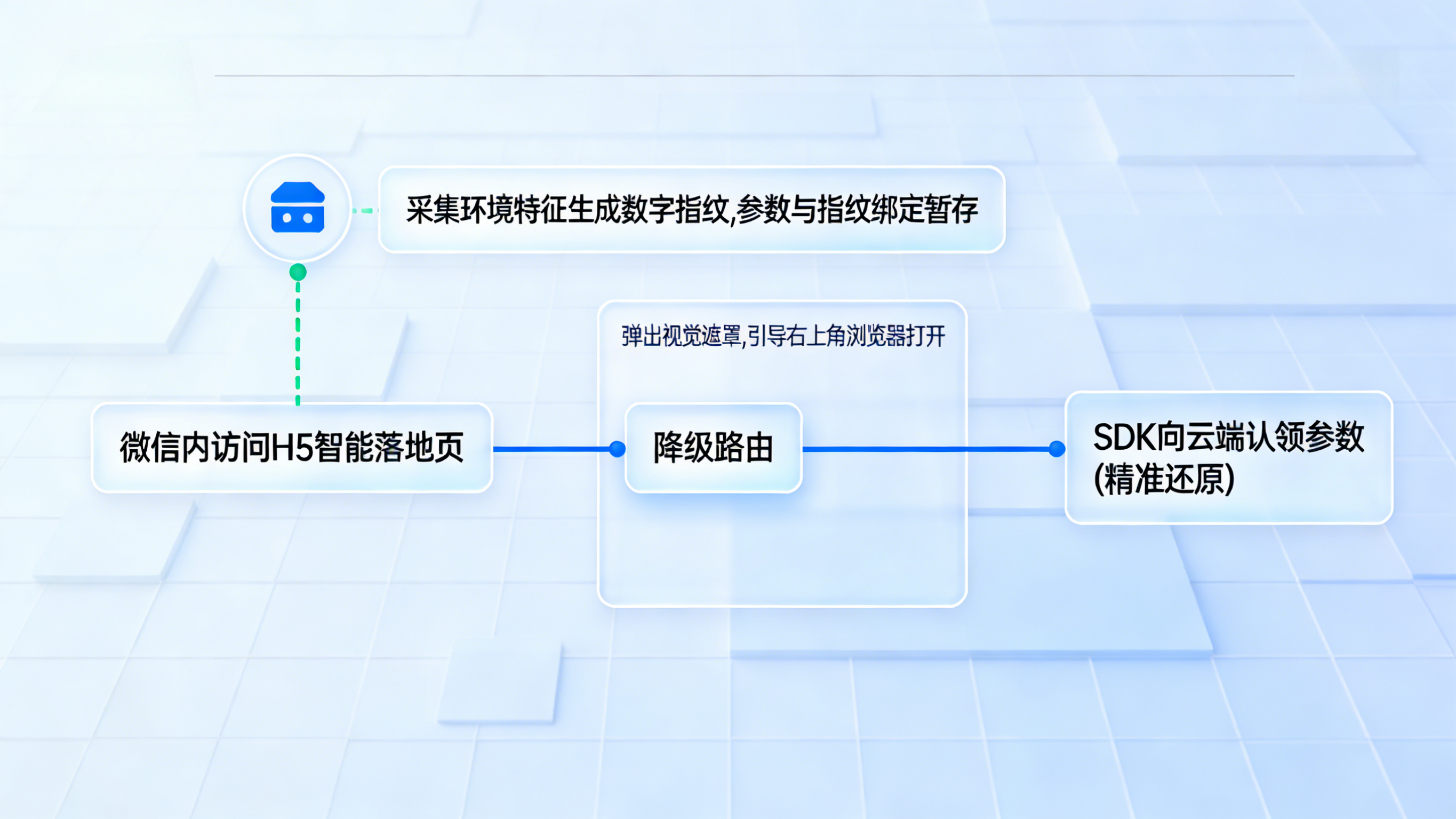 针对参数被清洗的痛点,行业内最有效的解决方案是使用 H5 智能落地页作为“跳板”。当用户在微信内访问该 H5 时,系统会立刻抓取当前的网络环境、IP、UA 等非敏感设备特征生成临时“数字指纹” 。随后,系统将原本要传递的渠道参数与该指纹绑定,安全地挂载存放到云端。当用户最终下载并打开 App 时,SDK 会再次生成指纹向云端认领参数,从而实现精准的接力归因。