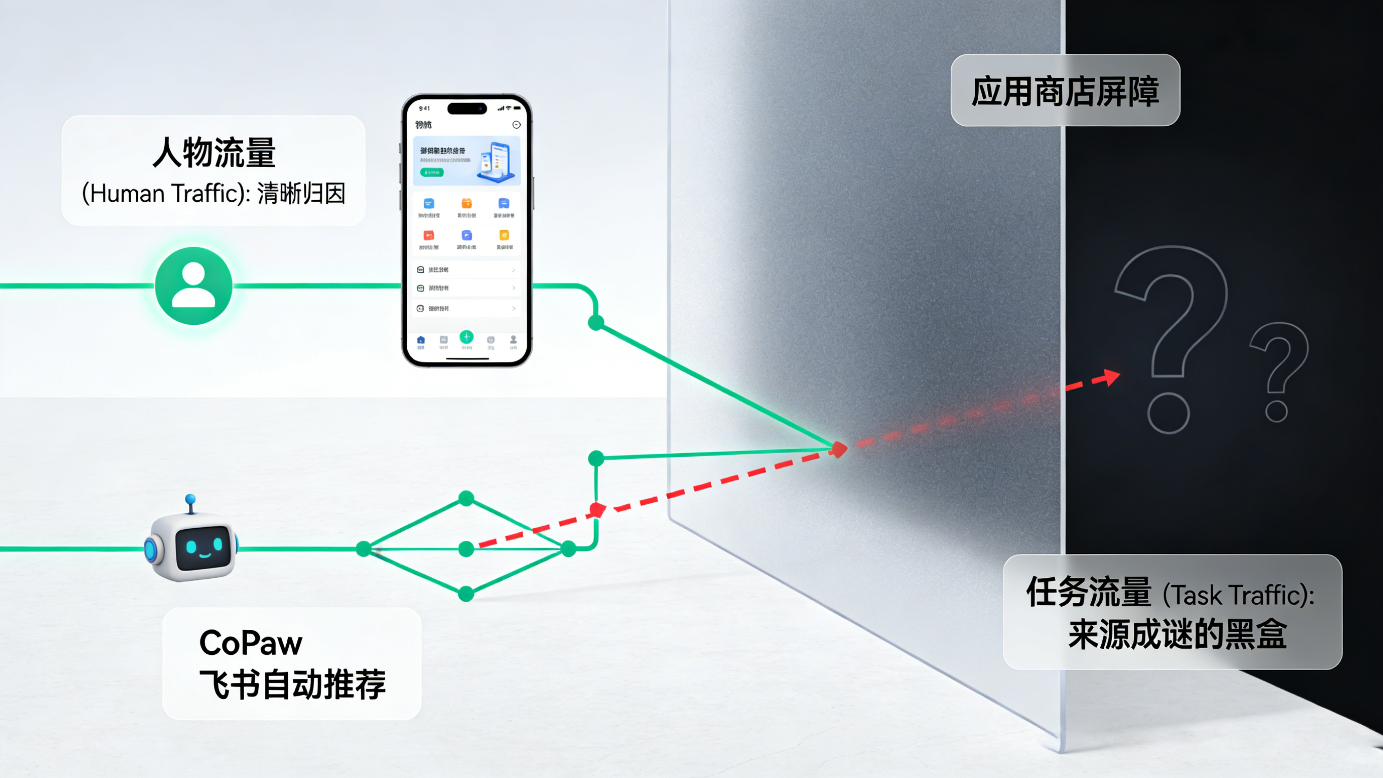 但如今,这个过程被“任务流量(Task Traffic)”取代了。试想一个场景:用户的 CoPaw 助理在每天早晨整理竞品财报时,发现需要依赖你的 App 才能下载某份深度数据。于是,CoPaw 自动在群里甩出一个链接让用户安装。在这个场景里,你的后台报表只会看到一个毫无来由的“自然新增”,你根本不知道这个用户是由飞书里的某个智能体推荐来的,更不知道他一打开 App 就亟需进入那个极其隐蔽的财报下载页。