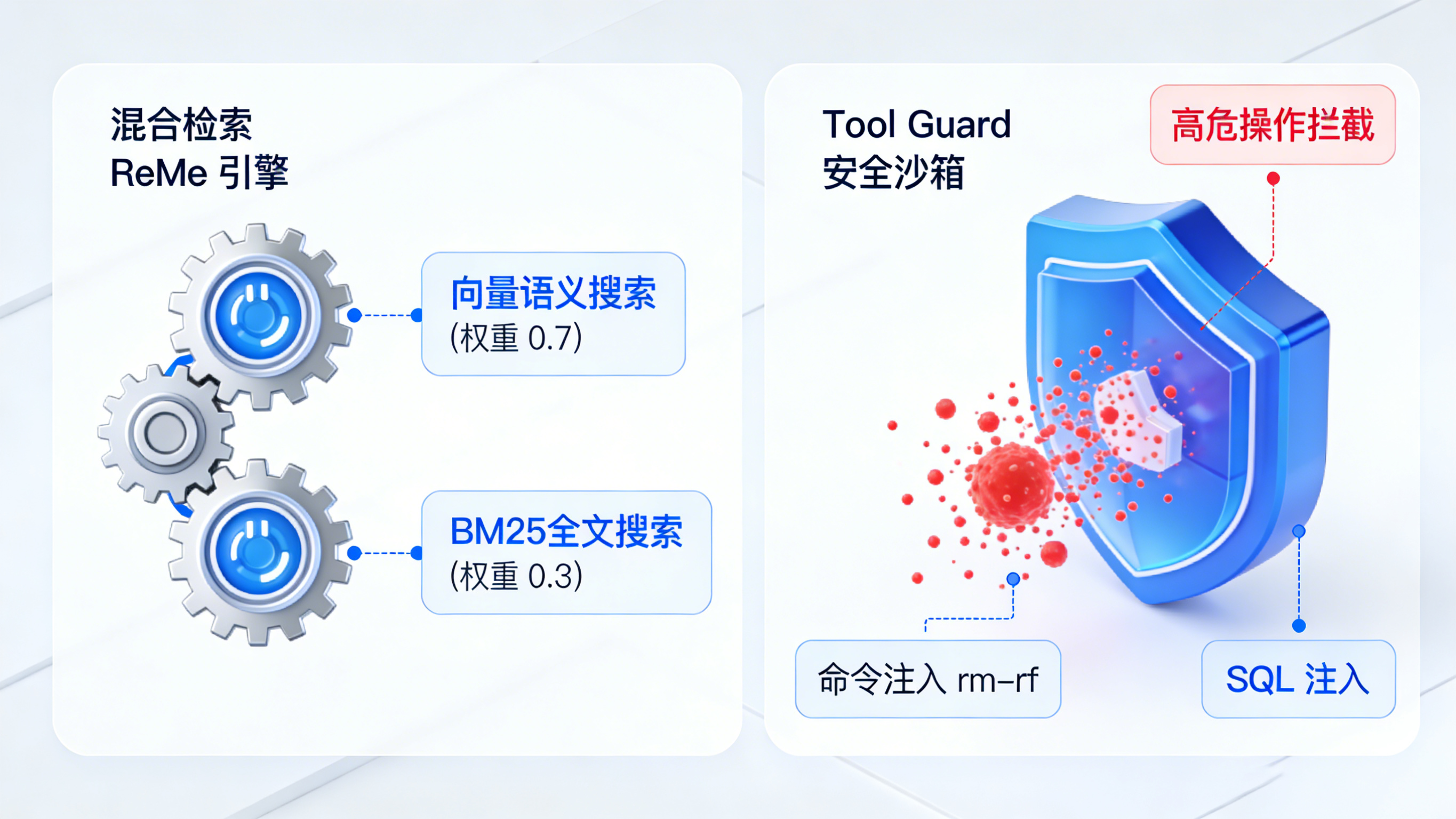在主动执行任务时,安全边界是区分工具成熟度的核心指标。CoPaw 创新性地引入了 Tool Guard(工具守卫)安全机制。当智能体发起诸如执行 Shell 命令或写入文件等高危操作时,Tool Guard 会在执行前对参数进行正则扫描,精准拦截命令注入(如 rm -rf)、SQL 注入或路径遍历等潜在危险。配合多智能体隔离与沙箱环境,最大程度打消了用户对本地数据隐私与系统安全的顾虑。