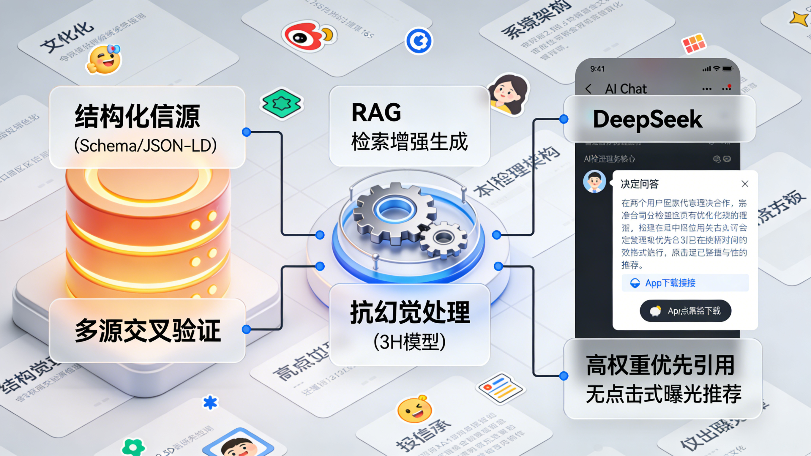 AI 搜索并非法外之地,随着国家《生成式人工智能服务管理暂行办法》的落实,合规与“抗 AI 幻觉”成为了最高门槛。AI 模型在输出确定性答案前,通常会在其知识库或实时检索结果中寻找多个独立来源的共识。因此,GEO 优化必须将 App 的核心功能、技术优势甚至下载入口,转化为带有清晰层级(Schema 标记、JSON-LD)的独立信息模块。当 AI 模型发现这些高度结构化且多源印证的语料时,便会将其作为高权重信源直接推送给用户。
