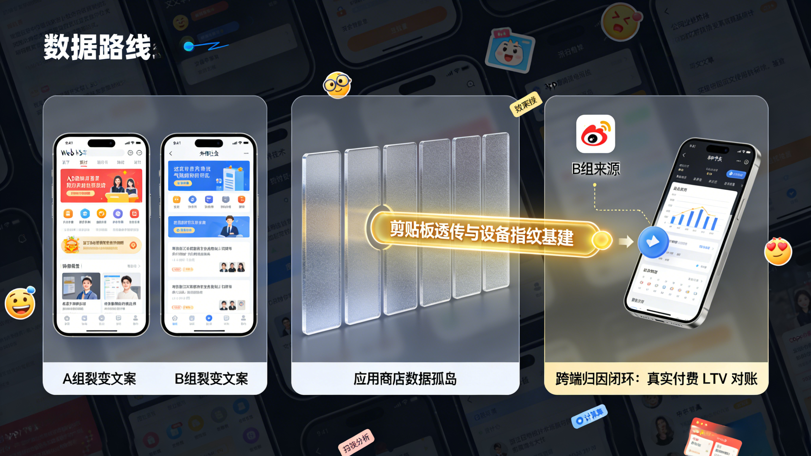 如果用户在微信里看了海报,随后去应用商店下载 App,常规的 AB 测试工具会因为无法穿透应用商店这座数据孤岛,而丢失分组标签。最终,产品经理根本无法统计这两组用户在 App 内的真实付费 LTV(生命周期价值)。
