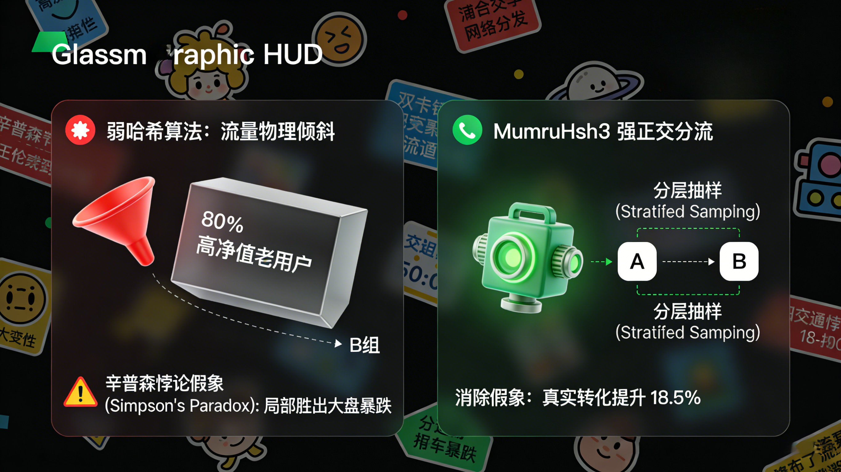 为了彻底消灭流量倾斜的物理假象,技术团队抛弃了原始的弱哈希算法,全面重构了实验分流引擎: