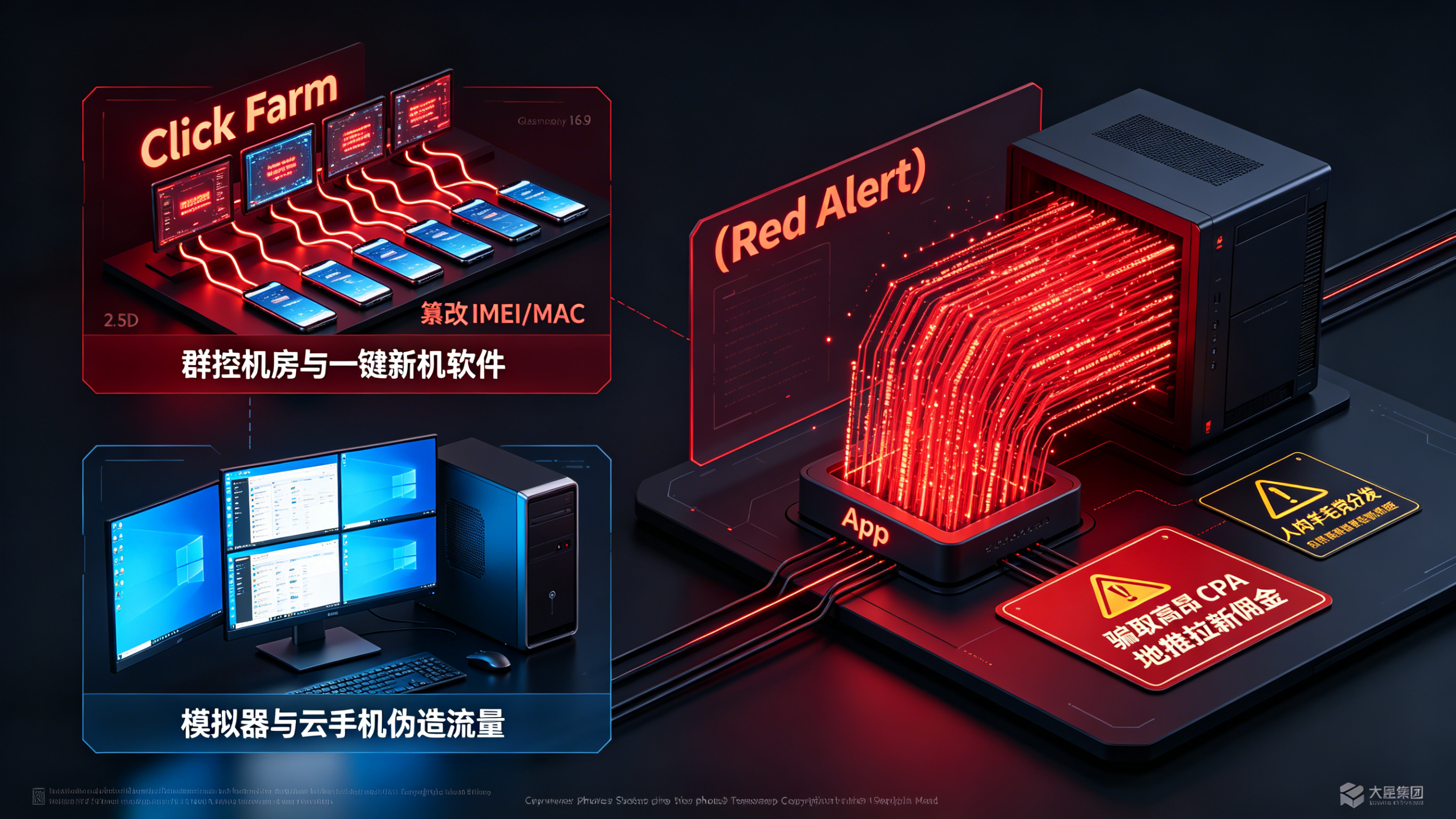 这是目前针对 App 地推最猖獗的物理刷量法。刷客通过 USB 数据线或局域网集中控制上百台廉价的二手真机,利用“一键新机”类改机软件,不断篡改手机底层的 Android ID、IMEI、MAC 地址以及系统版本号。在应用层看来,这就像是无数个全新的真实用户在不断下载激活 App。黑产利用自动化脚本,一天之内就能骗取地推人员成千上万的拉新提成。
