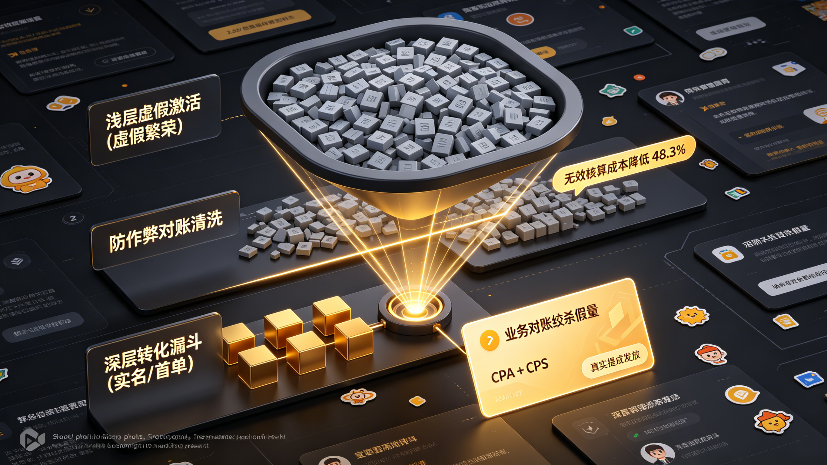 防刷量最立竿见影的管理手段是改变分润规则。很多地推团队被薅羊毛,根本原因是采用了 CPA(按激活结算)的单一模式。地推的考核指标必须向后延伸,采用 CPA+CPS 结合的方式。例如,地推拉来一个新用户激活只给 2 元底薪,只有当该用户在 App 内完成“实名认证”、“绑定银行卡”或“完成首单支付”等深层转化时,才发放 20 元的全额提成。这不仅能过滤掉无效假量,还能极大拔高黑产作假的成本。